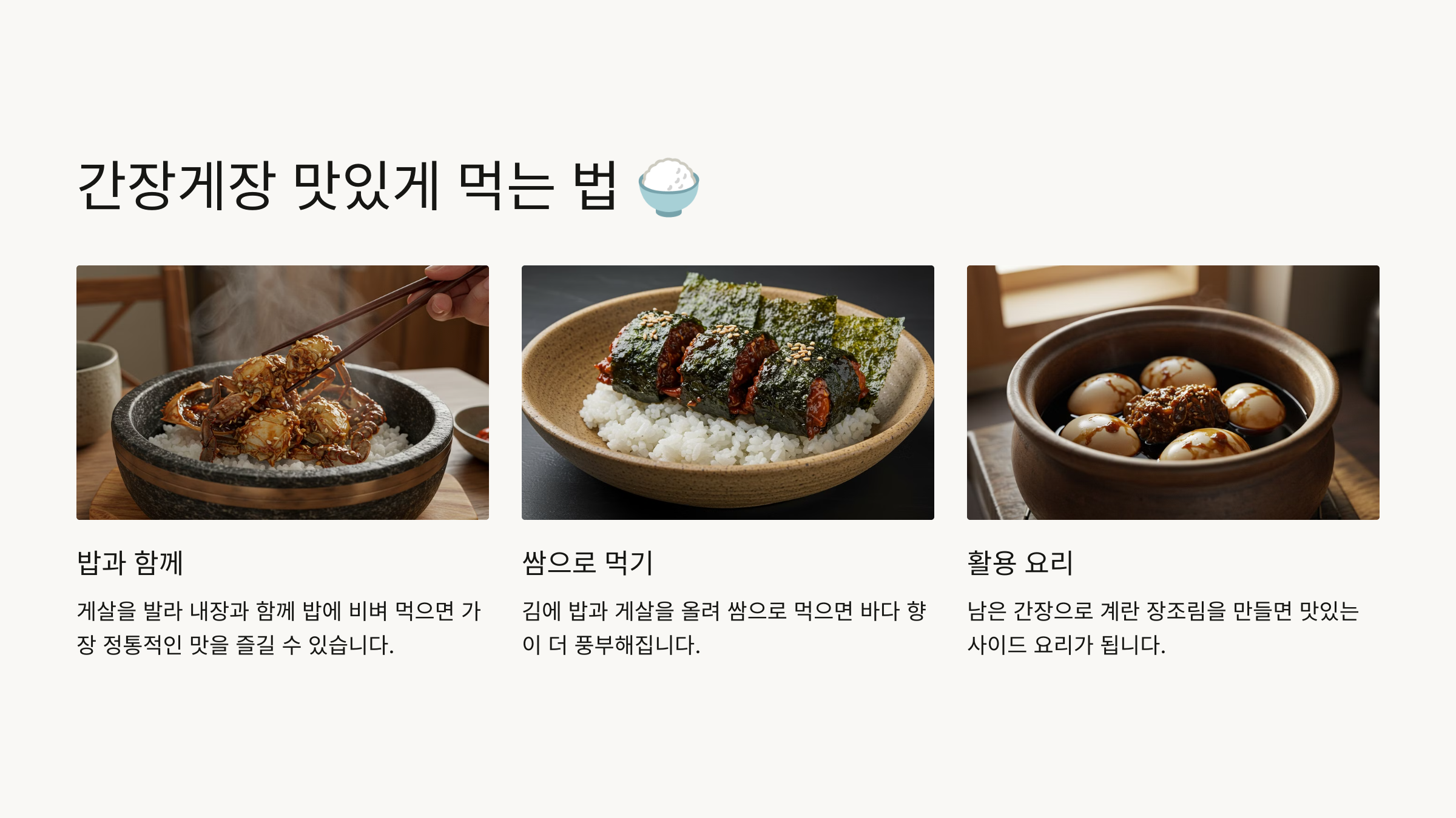 오늘은 집에서도 맛있고 안전하게 만들 수 있는 간장게장 비법을 알려드릴게요! 🍚