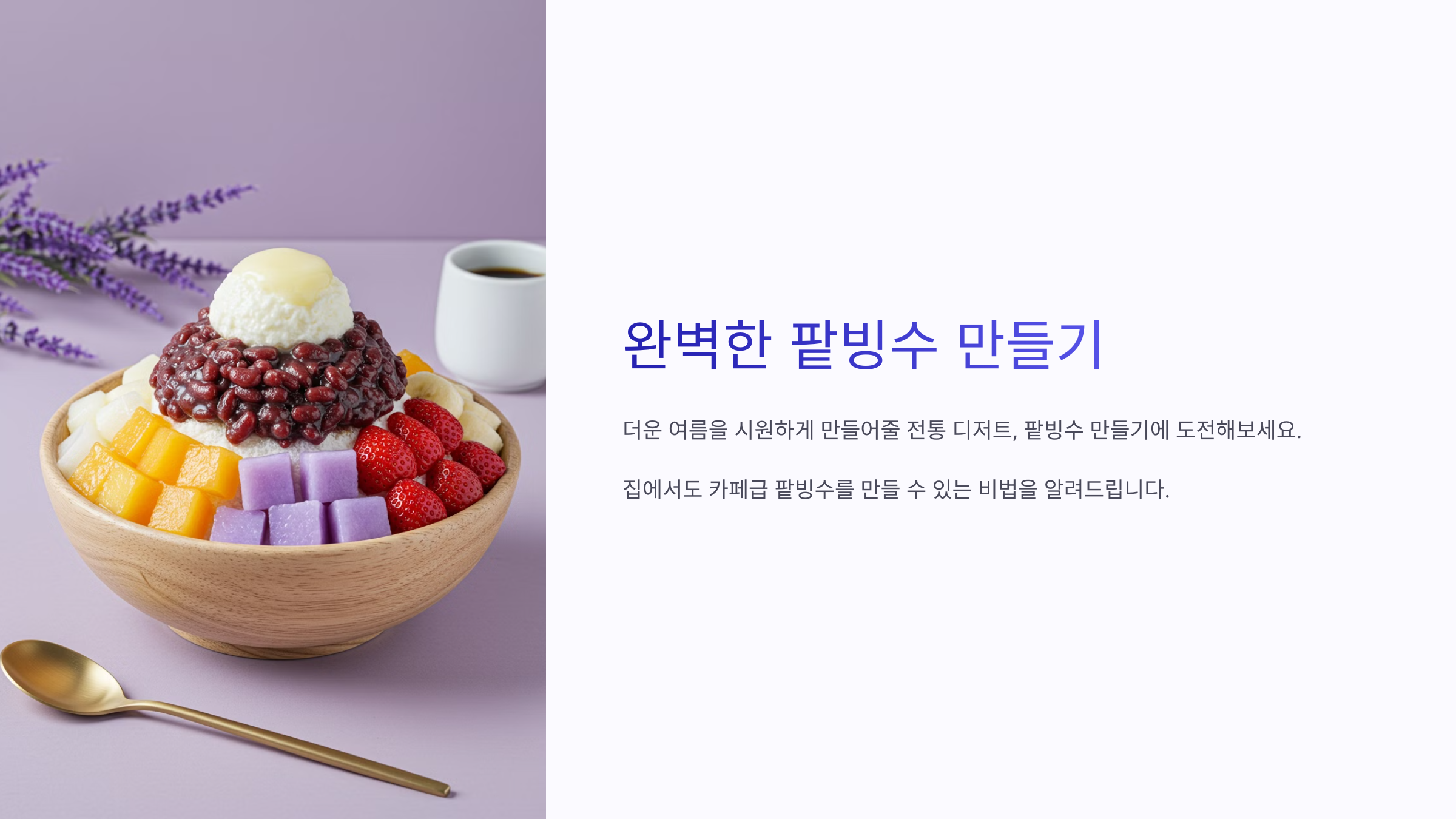 안녕하세요, 여러분! 😊 무더운 여름, 시원하고 달콤한 **팥빙수** 한 그릇이면 더위도 싹 날아가죠? 오늘은 카페에서 먹는 것보다 더 맛있고 **간편하게 집에서 만들 수 있는 팥빙수 레시피**를 알려드릴게요! 🍧