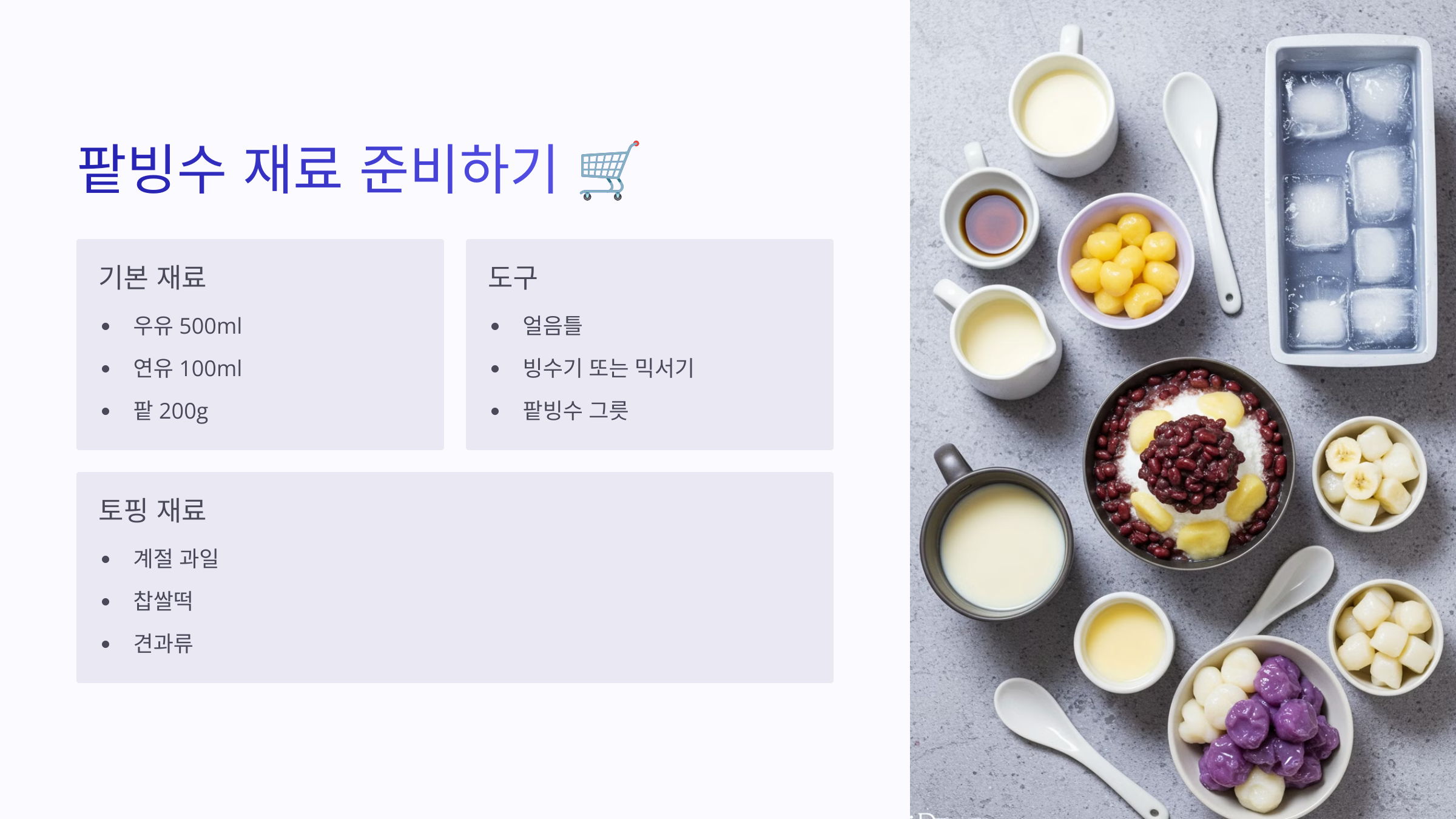1. 팥빙수 재료 준비하기 🛒