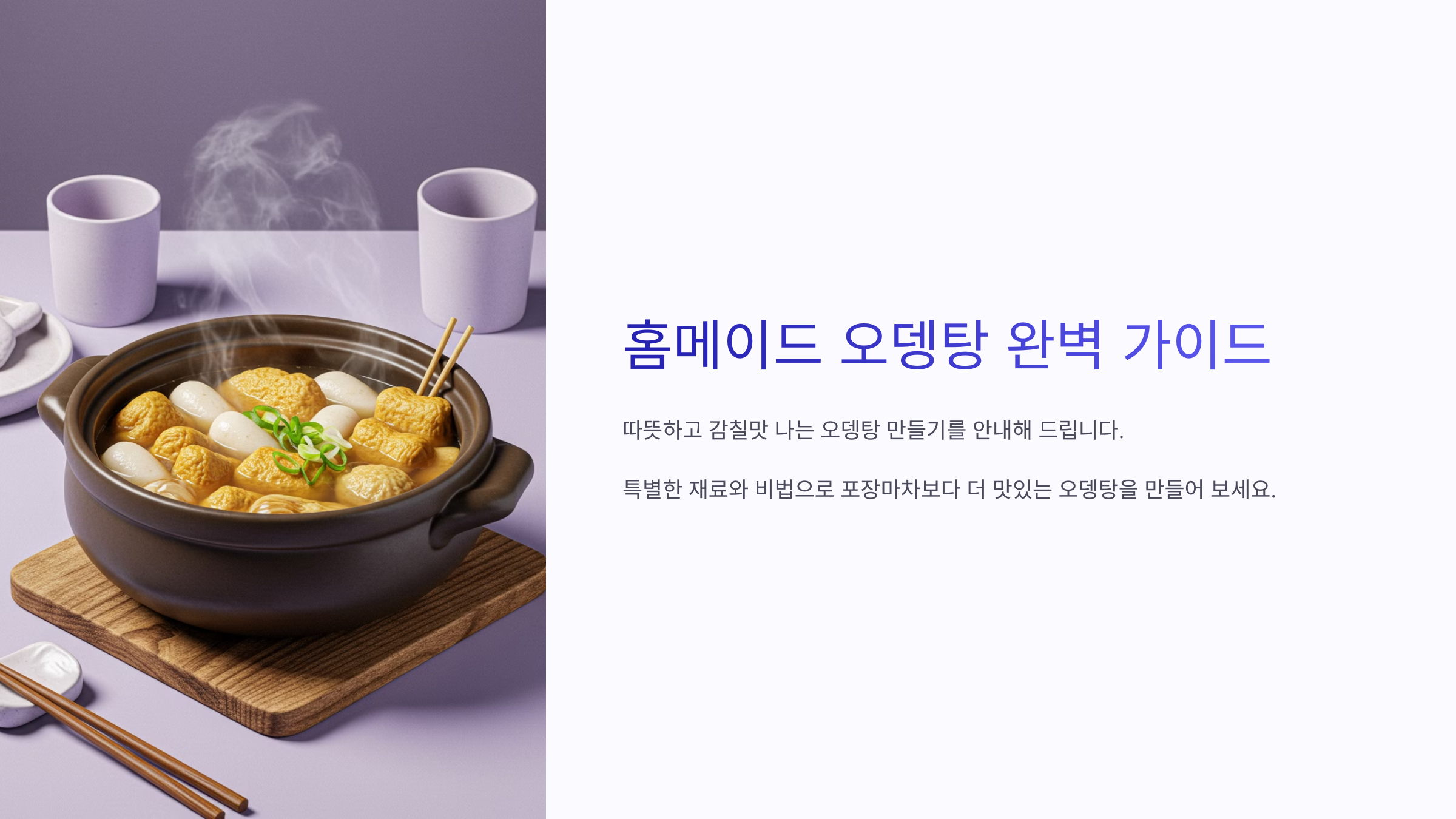 안녕하세요, 여러분! 😊 추운 날씨엔 따뜻한 국물 요리가 최고죠? **오뎅탕(어묵탕)**은 깊은 감칠맛을 느낄 수 있는 간단한 국물 요리예요. 오늘은 **육수를 제대로 우려내 깊고 시원한 국물 맛을 살린 오뎅탕 황금 레시피**를 소개할게요! 🍢🔥