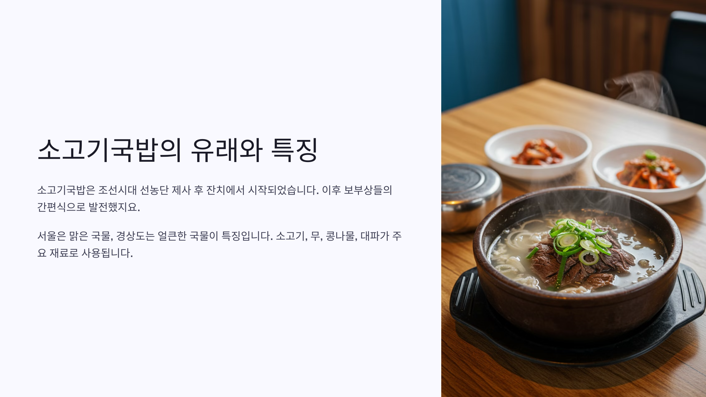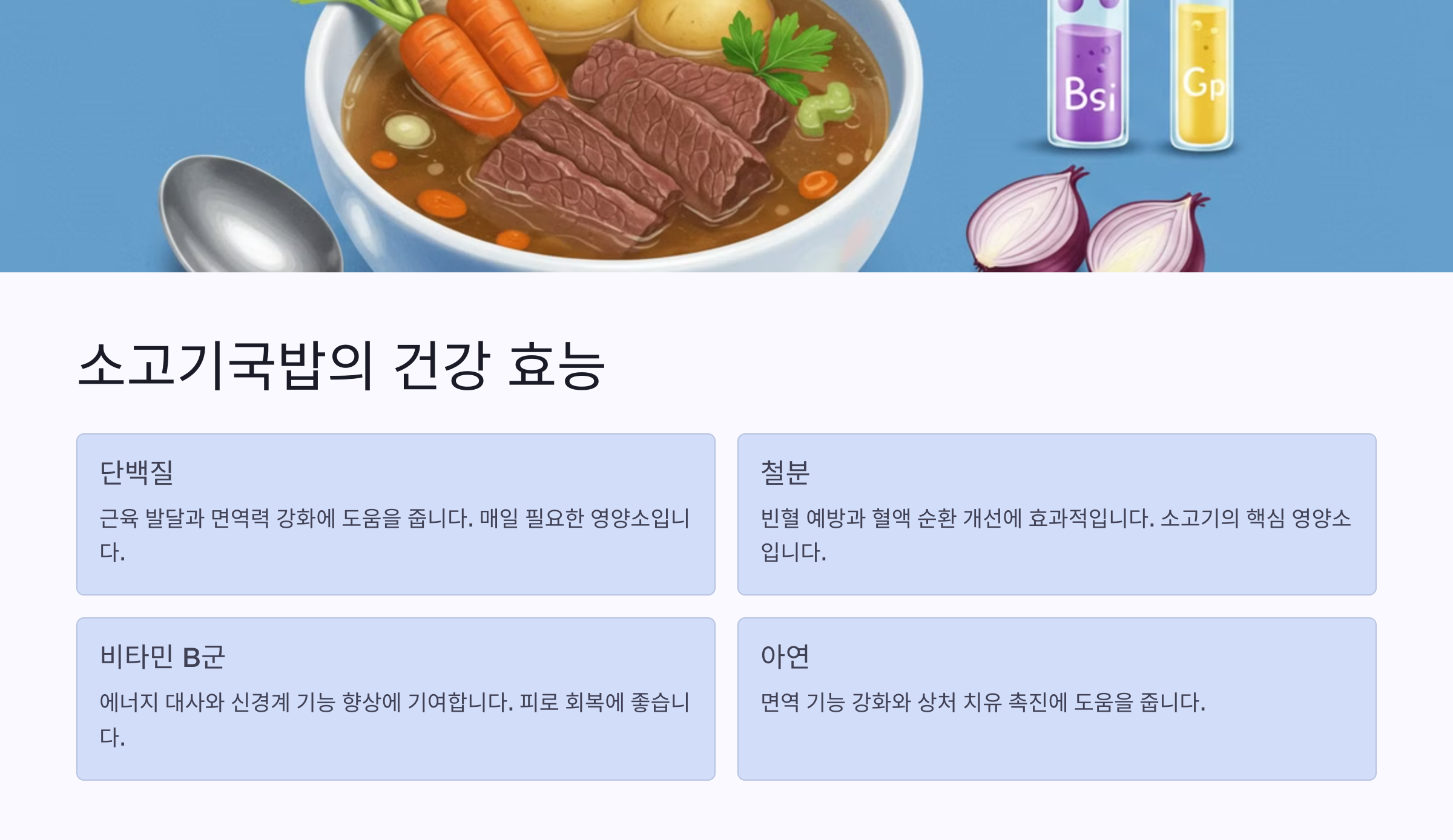 안녕하세요, 여러분! 😊 쌀쌀한 날씨에 딱 어울리는 음식, 바로 소고기국밥이죠! 깊고 진한 국물에 부드러운 소고기가 어우러져 한 입 떠먹으면 속이 든든해지는 그 맛! 하지만 여러분, 소고기국밥이 왜 이렇게 맛있는지, 그리고 건강에도 좋은 이유를 알고 계시나요? 오늘은 소고기국밥의 유래부터 맛있게 먹는 법, 건강 효능까지 모두 알려드릴게요! 끝까지 함께해 주세요! 😋