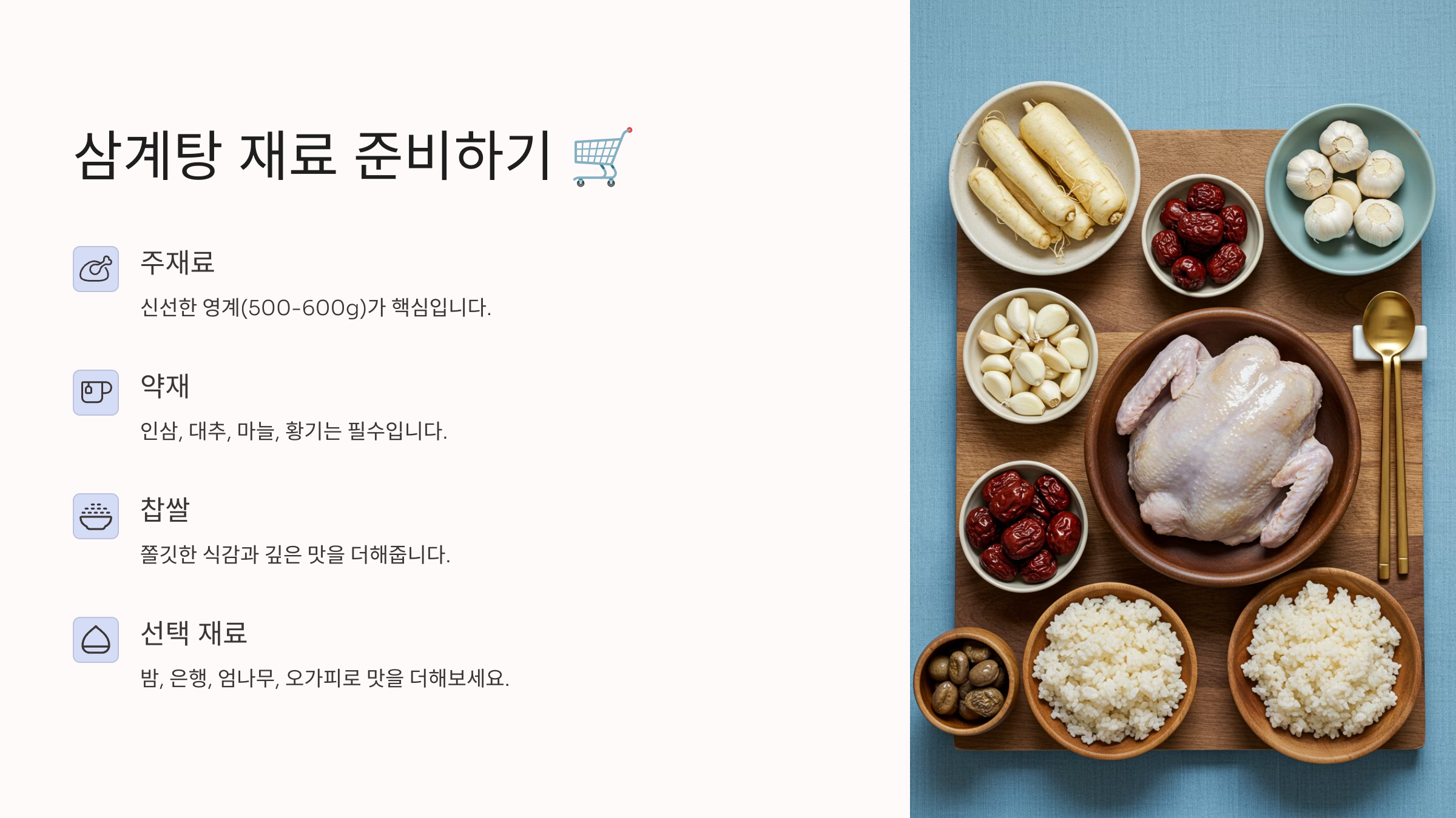 삼계탕의 깊은 맛을 내기 위해 **신선한 닭과 한방 재료**가 필요해요! 몸에 좋은 건강 재료를 듬뿍 넣어 든든한 보양식을 만들어볼까요? 😊