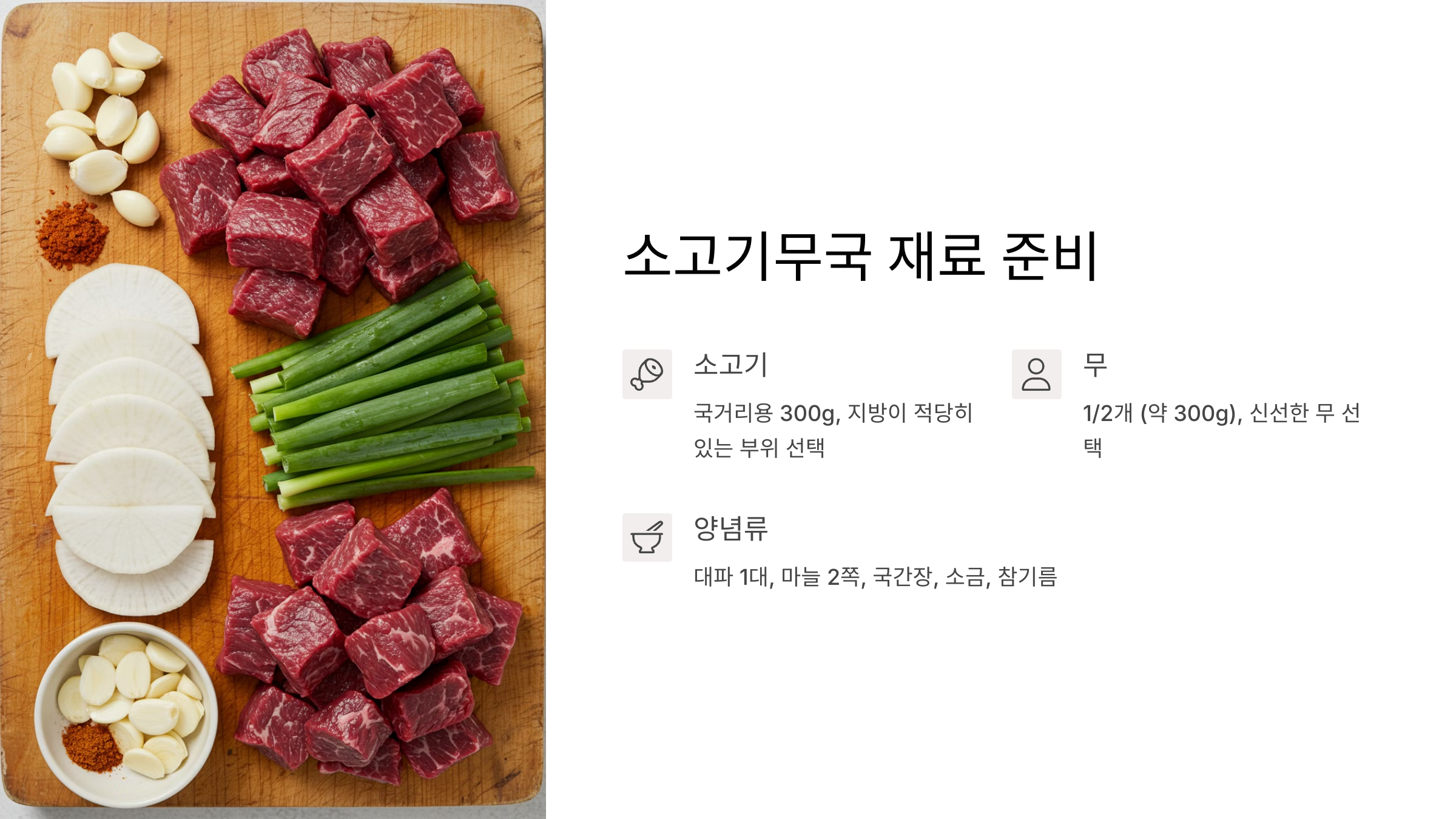 | 맑은 소고기무국 | 국물이 맑고 깔끔한 기본 스타일 | 국간장, 대파 |