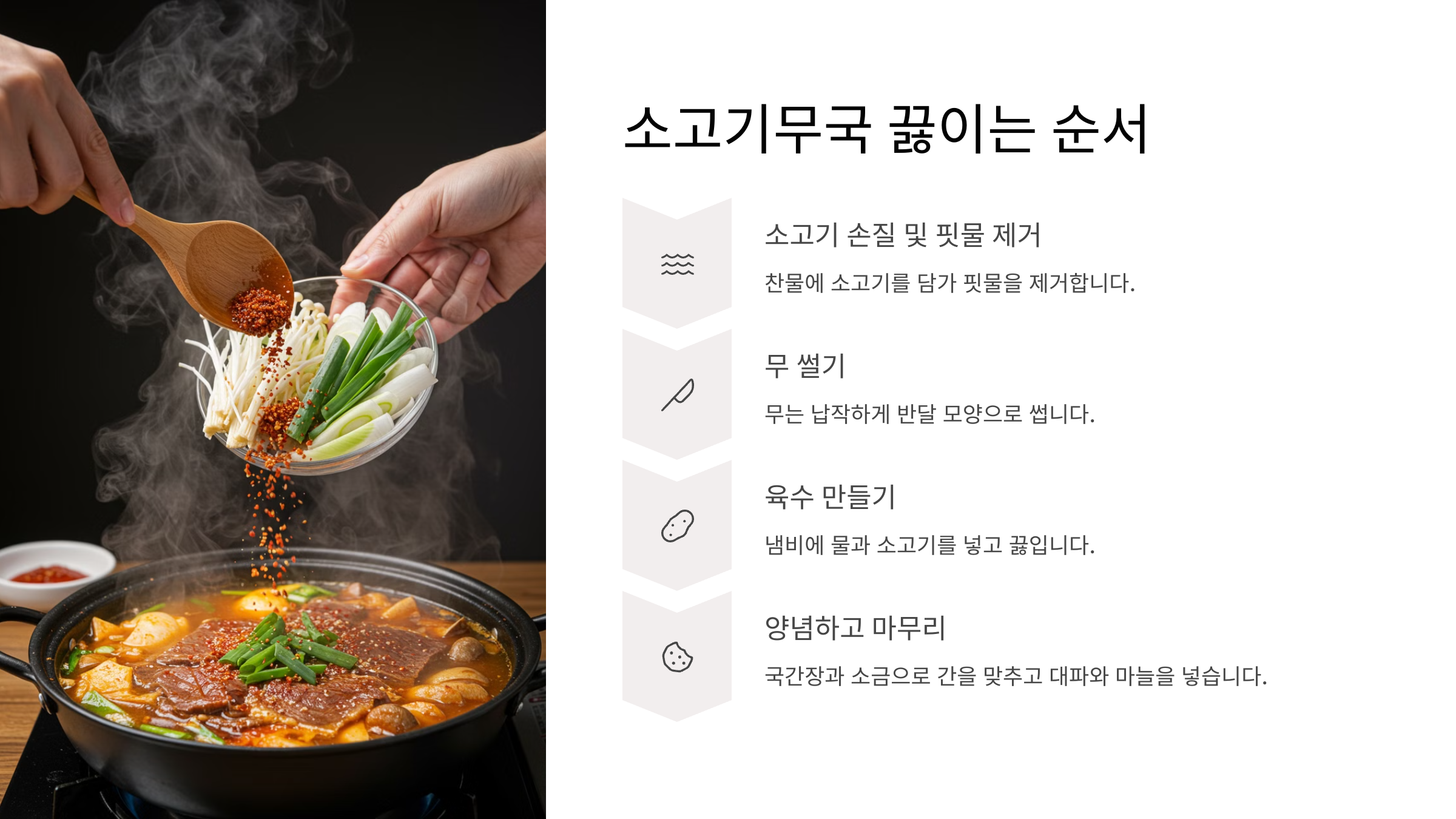 소고기무국은 기본만 지켜도 깊고 시원한 국물이 완성돼요! 요리 초보자도 쉽게 따라 할 수 있도록 간단한 과정으로 정리해볼게요. 😉