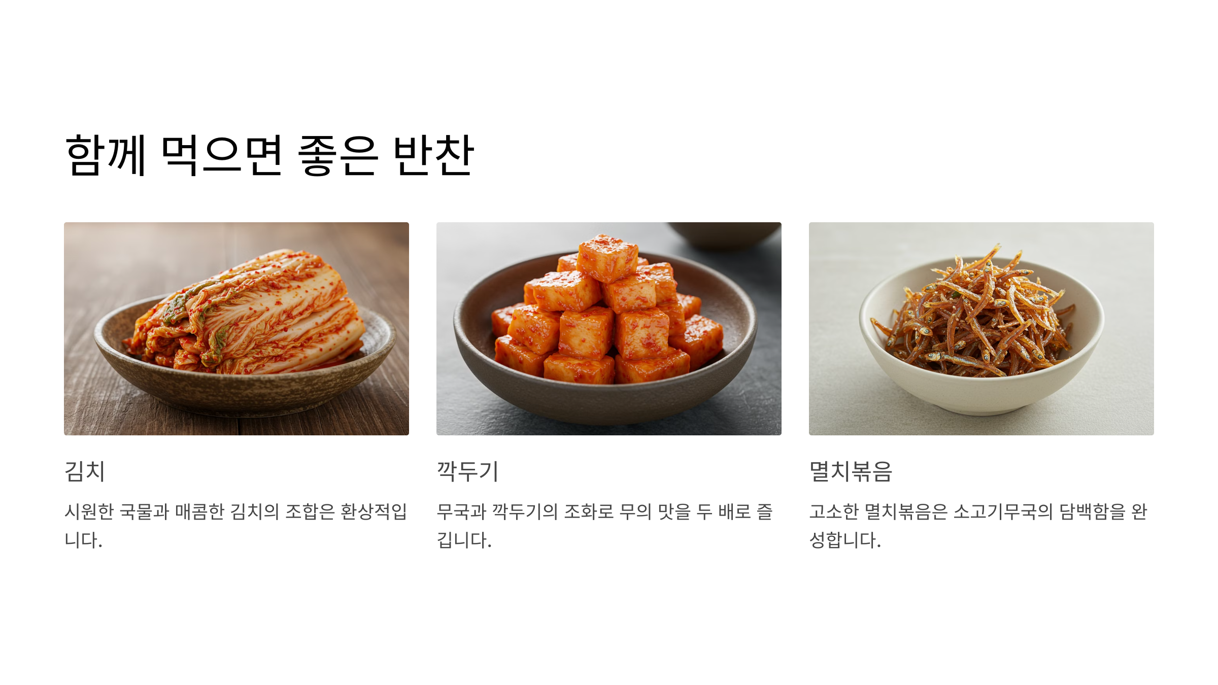 소고기무국은 그 자체로도 맛있지만, 곁들일 반찬이 있으면 더욱 든든한 한 끼가 돼요! 짭조름한 밑반찬부터 아삭한 김치까지, 국과 환상 궁합을 자랑하는 반찬들을 소개할게요. 😋