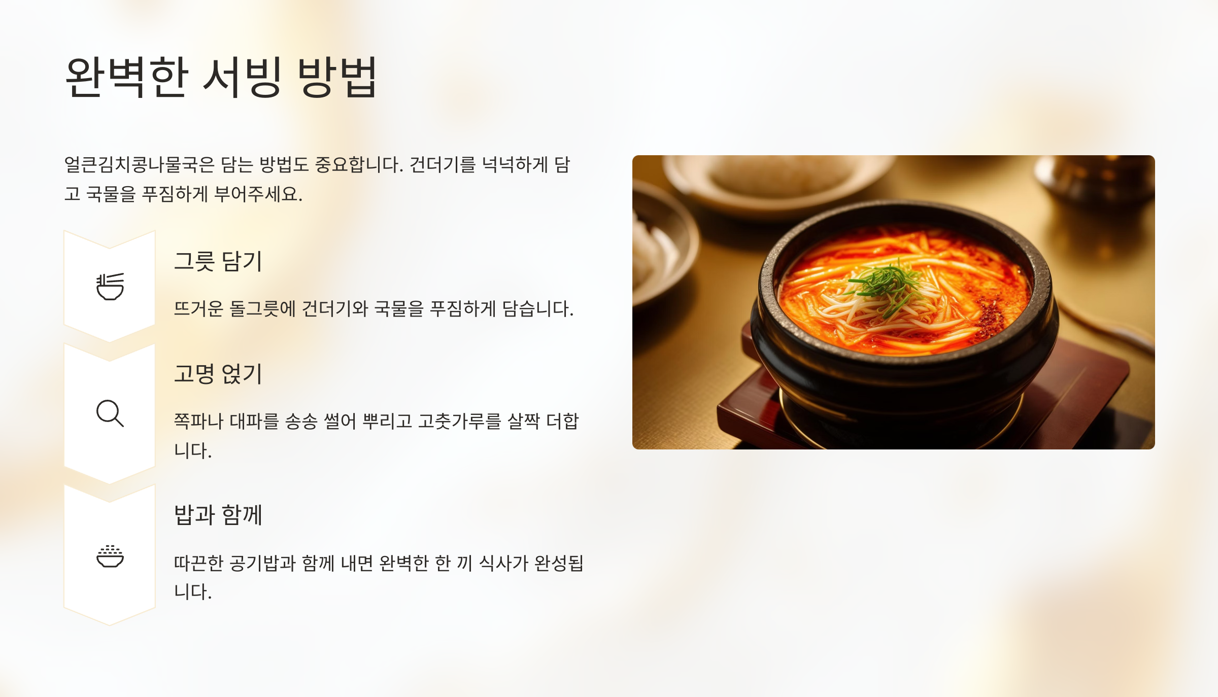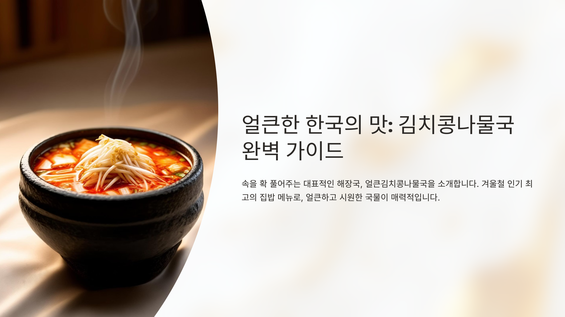 "김치콩나물국은 아침 해장국으로도 사랑받는 메뉴입니다. 신선한 재료만 준비한다면, 그날의 피로를 싹 풀어줄 수 있는 얼큰하고 깊은 맛을 집에서도 손쉽게 즐길 수 있습니다."