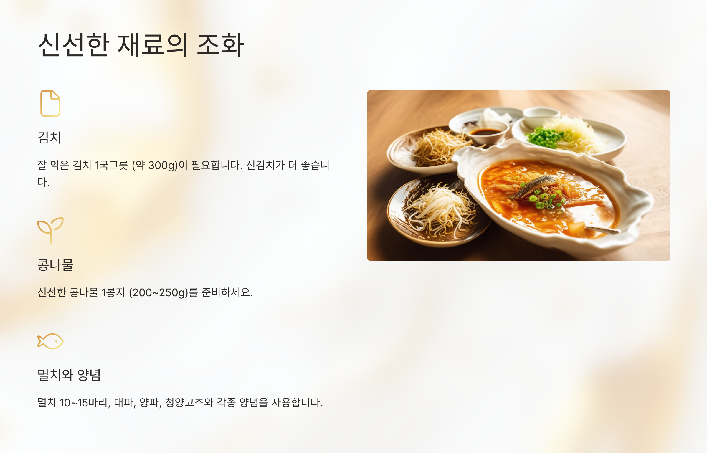 - 주재료: 신선한 콩나물, 잘 익은 김치, 고추장, 국간장