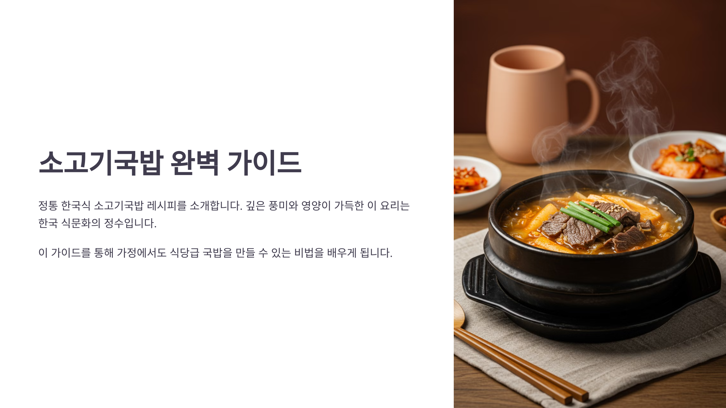 안녕하세요, 여러분! 😊 깊고 구수한 국물에 부드러운 소고기가 듬뿍 들어간 **소고기국밥**! 쌀쌀한 날씨에 한 그릇 뚝딱 하면 속이 따뜻해지고 든든해지는 음식이죠. 오늘은 집에서도 간단하게 만들 수 있는 **소고기국밥 황금 레시피**를 알려드릴게요! 🍚🔥