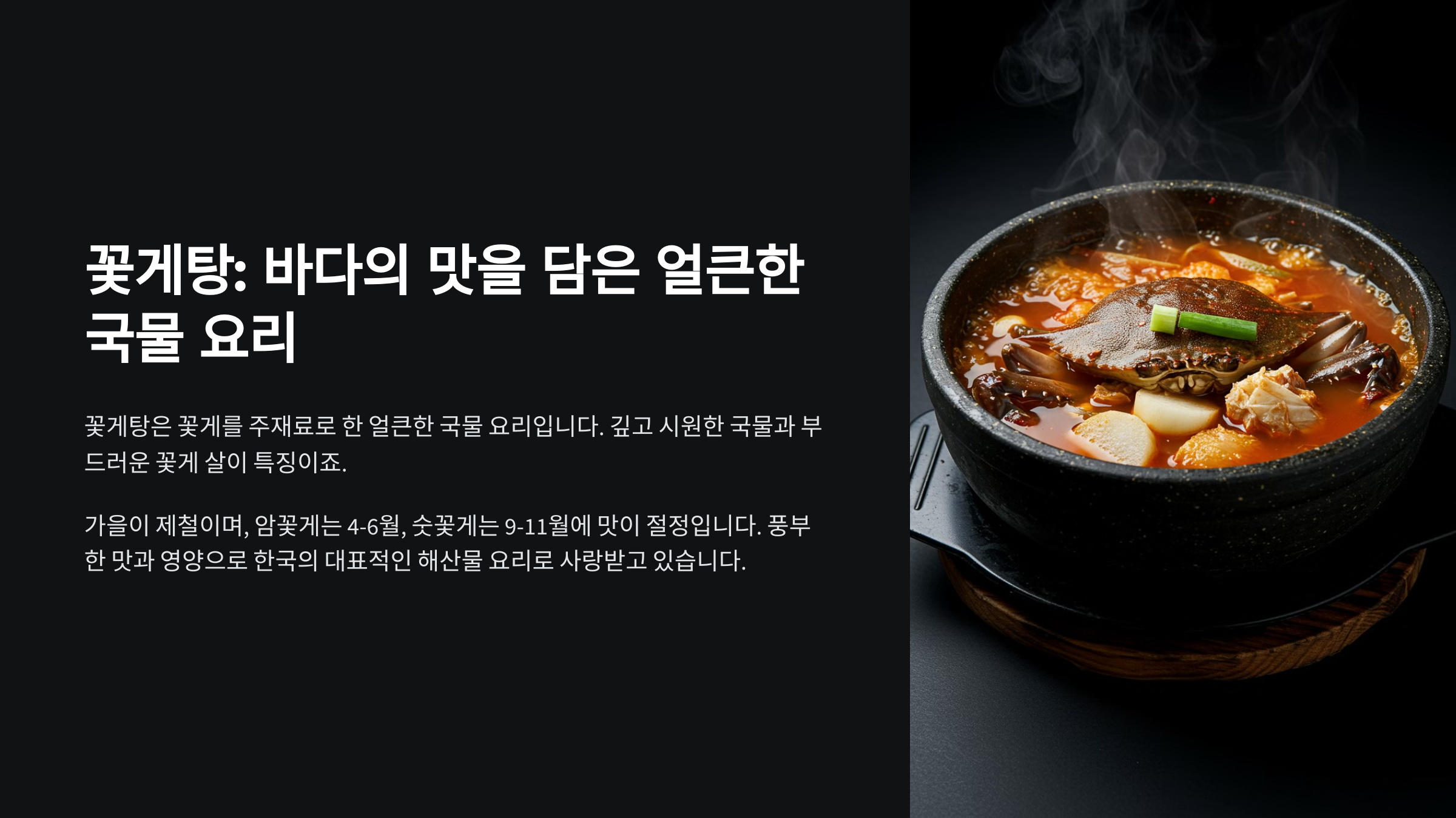 가을 꽃게는 알이 꽉 차 고소한 맛이 강하고, 봄 꽃게는 살이 단단해 쫄깃한 식감을 자랑해요. 얼큰한 국물에 부드러운 게살을 발라 먹는 재미까지 더해져 남녀노소 모두에게 사랑받는 요리랍니다. 🍲🦀