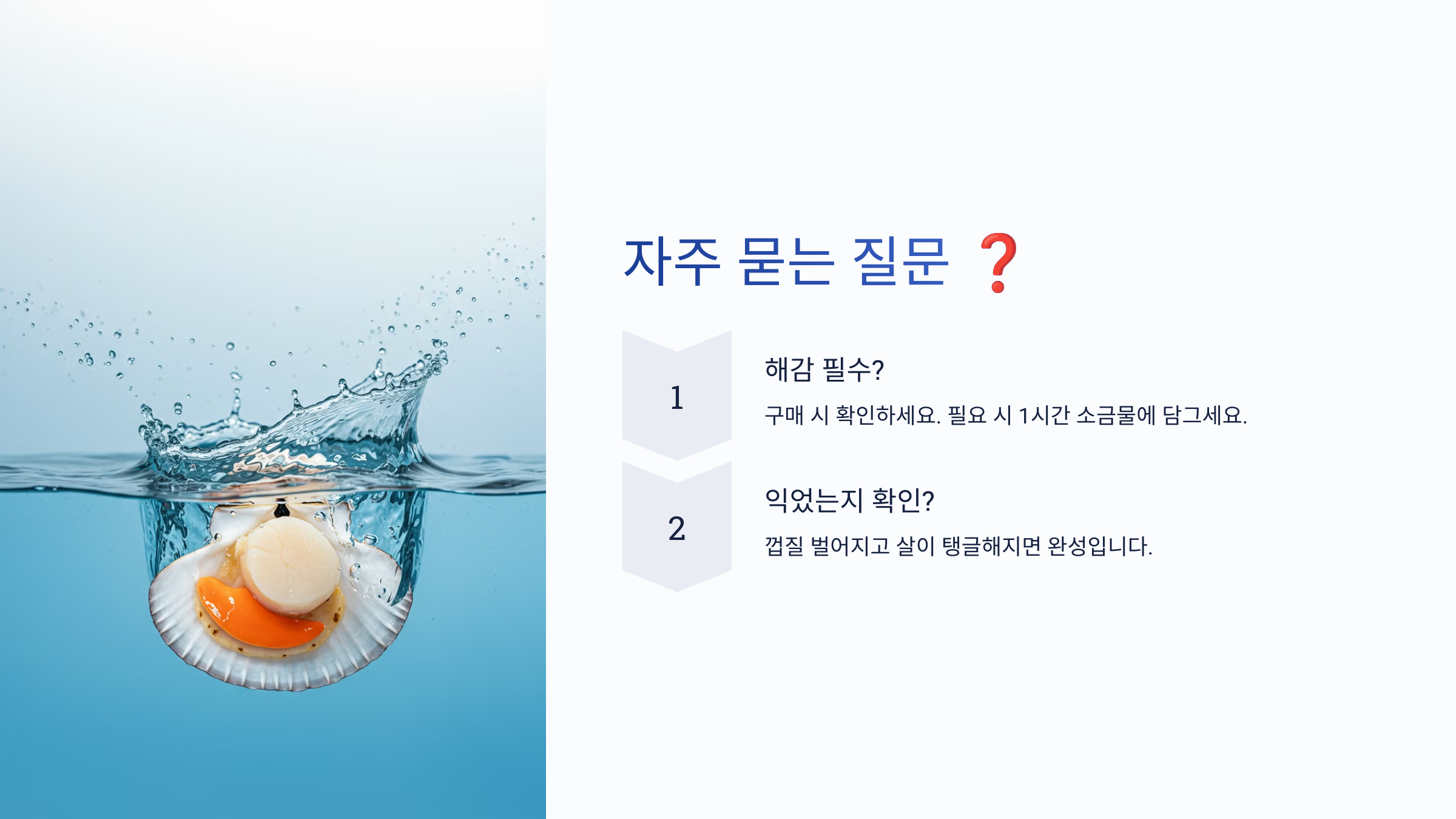 - 가리비를 냉동 보관해도 되나요? 네, 밀폐용기에 넣어 냉동하면 1~2개월 보관 가능해요.