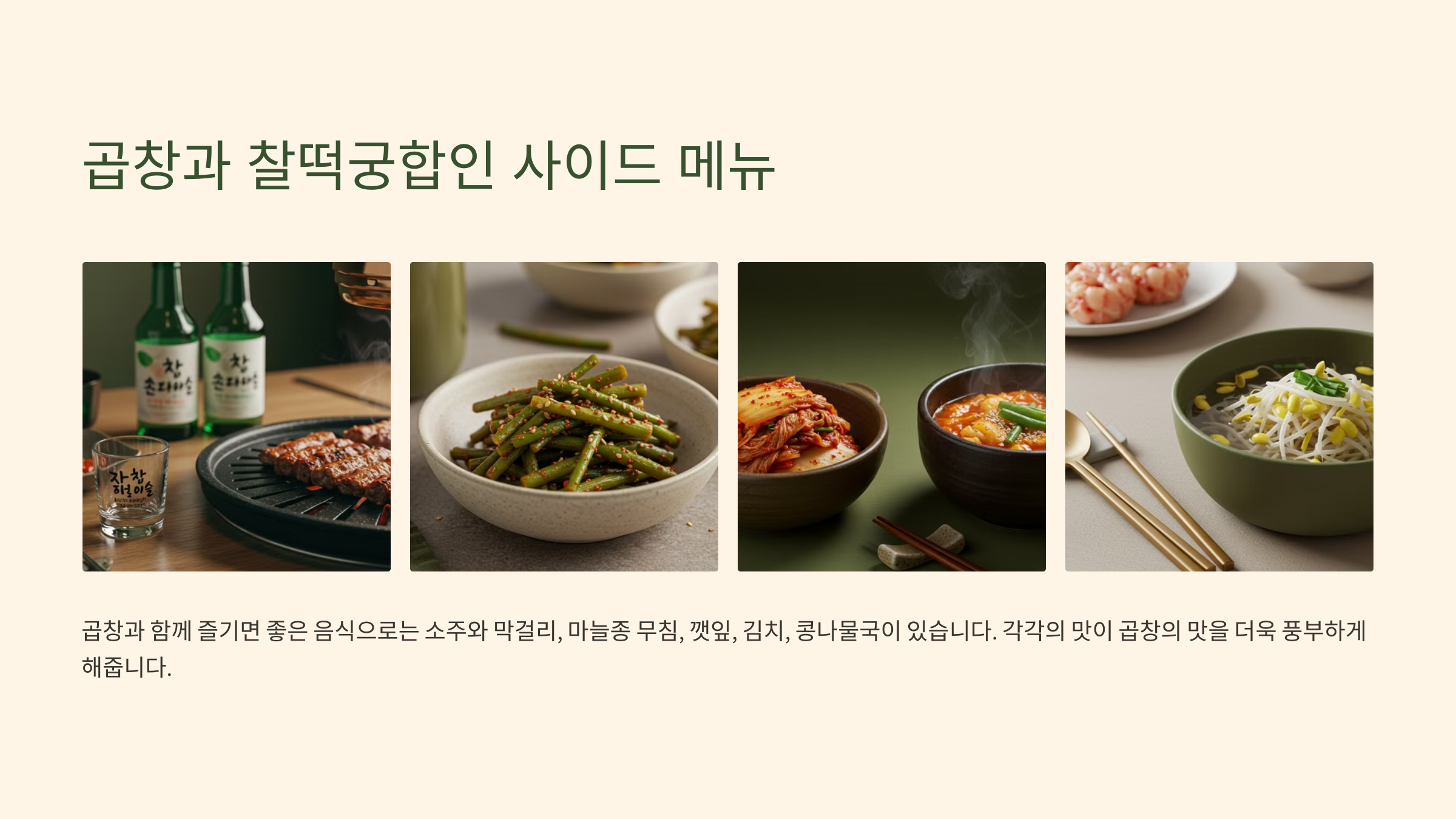 곱창만 먹어도 맛있지만, 함께 먹으면 더 환상적인 조합이 있어요! 곱창과 잘 어울리는 사이드 메뉴를 추천해드릴게요.