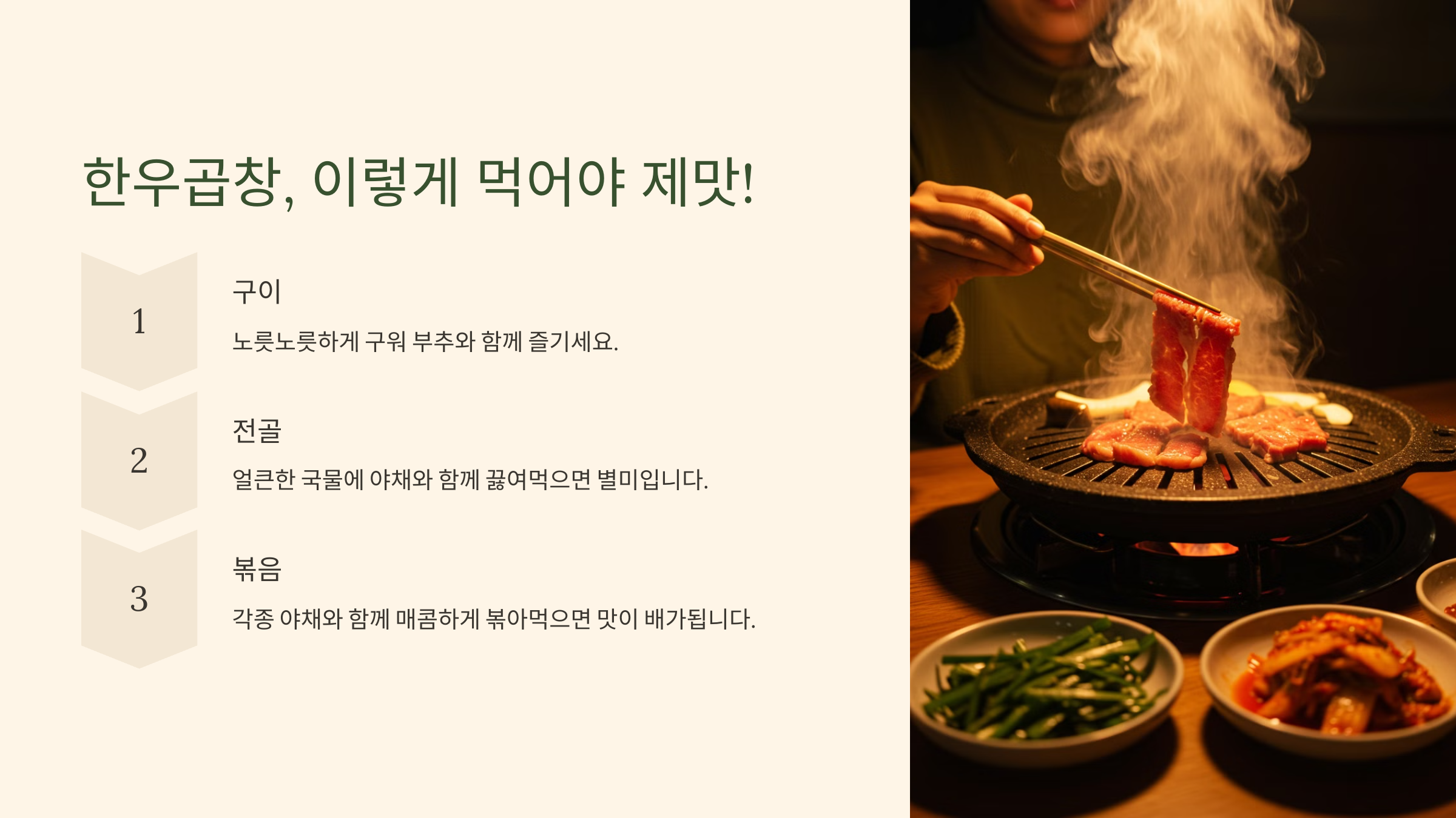 한우곱창을 제대로 즐기기 위해서는 조리법과 곁들여 먹는 재료가 중요해요! 보통 소금구이, 양념구이, 전골 등 다양한 방식으로 먹을 수 있는데요.