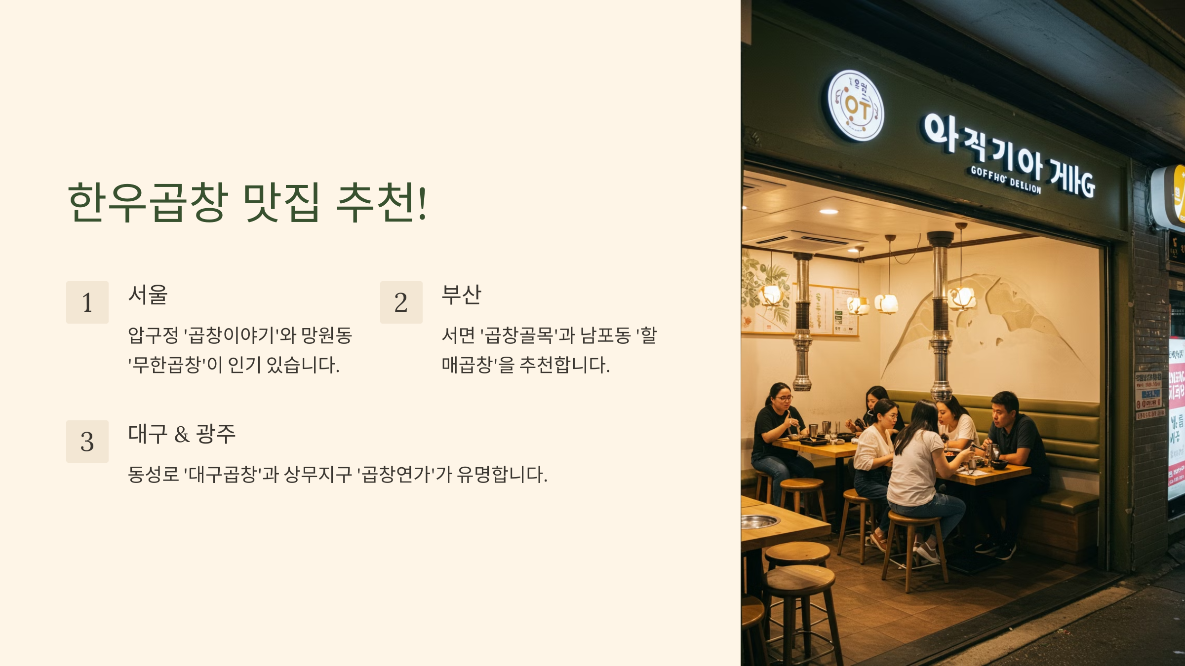 곱창을 집에서 먹는 것도 좋지만, 전문 맛집에서 제대로 즐기는 것도 특별한 경험이죠! 전국적으로 유명한 한우곱창 맛집을 몇 곳 추천해드릴게요. 😊