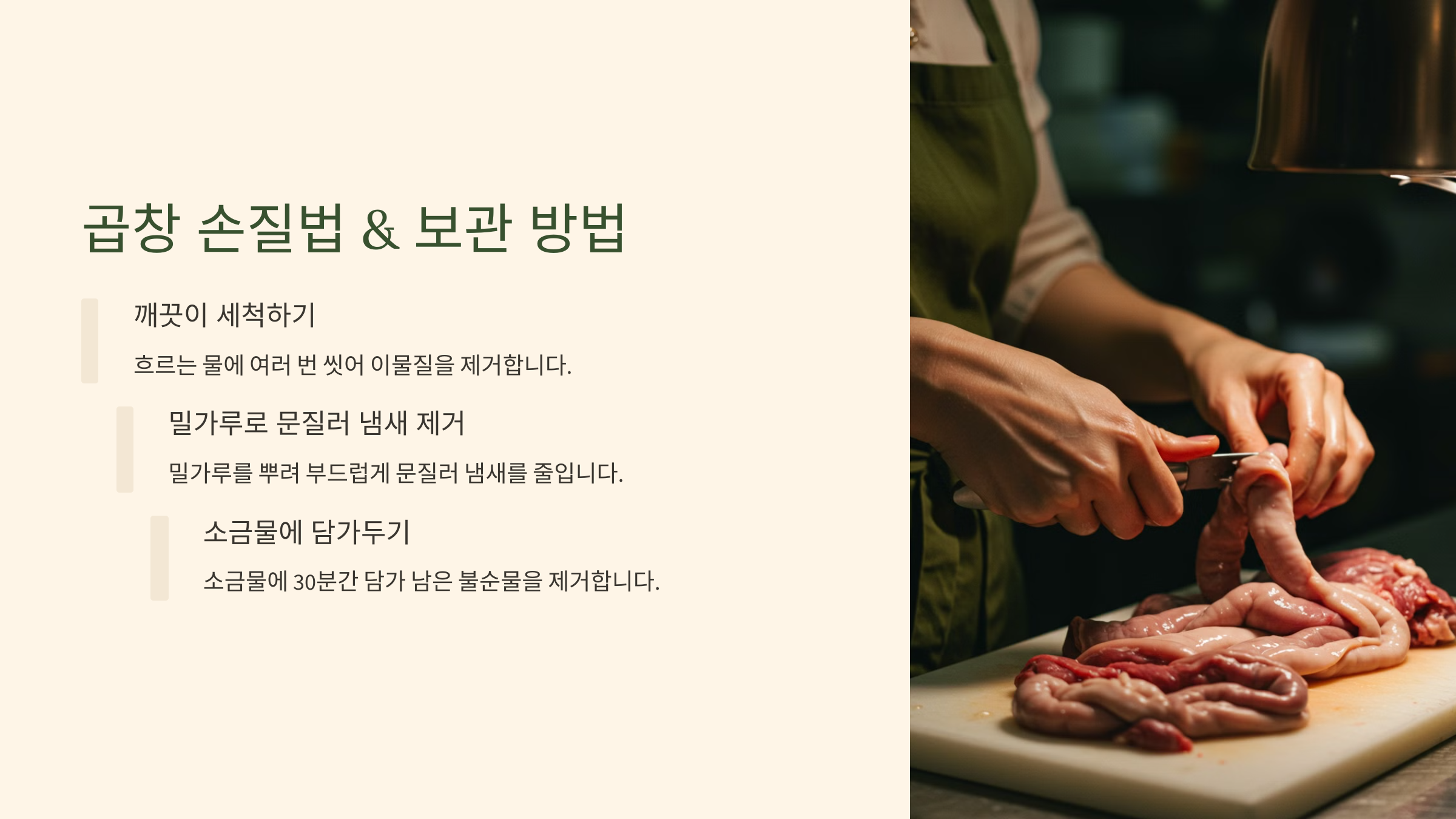 - 손질 방법: 곱창을 흐르는 물에 깨끗이 씻고, 밀가루나 소금을 이용해 잡내를 제거해주세요.