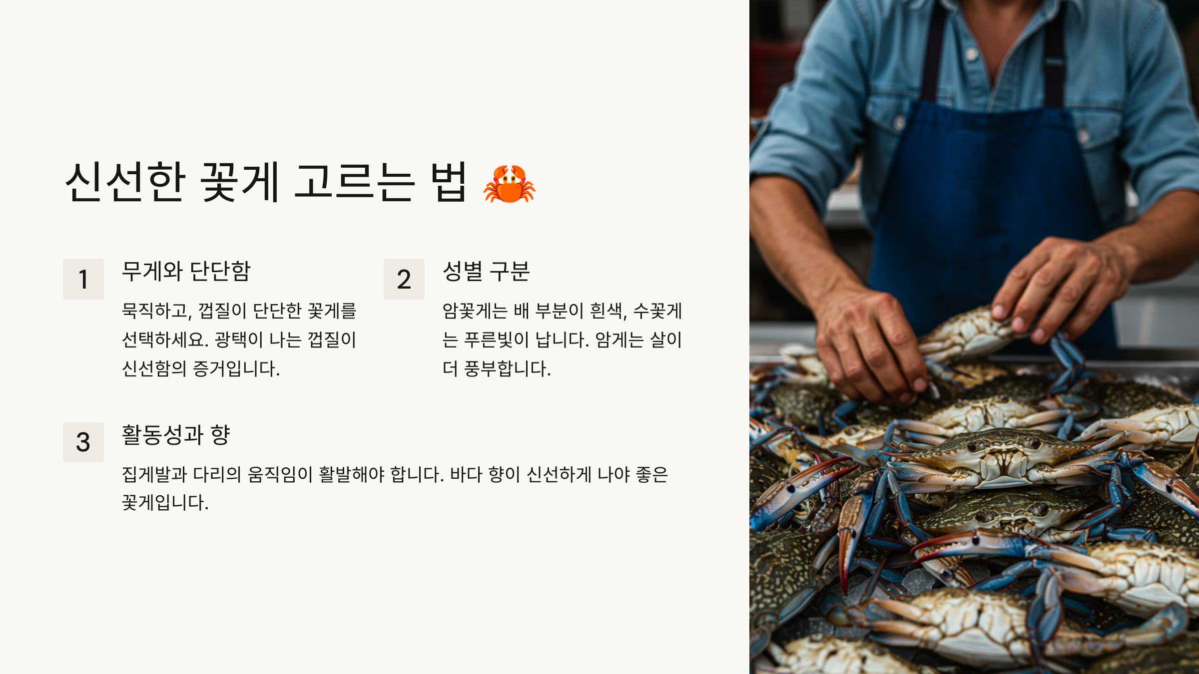 - 계절에 따라 고르기 - 봄에는 암꽃게, 가을에는 수꽃게를 추천해요.