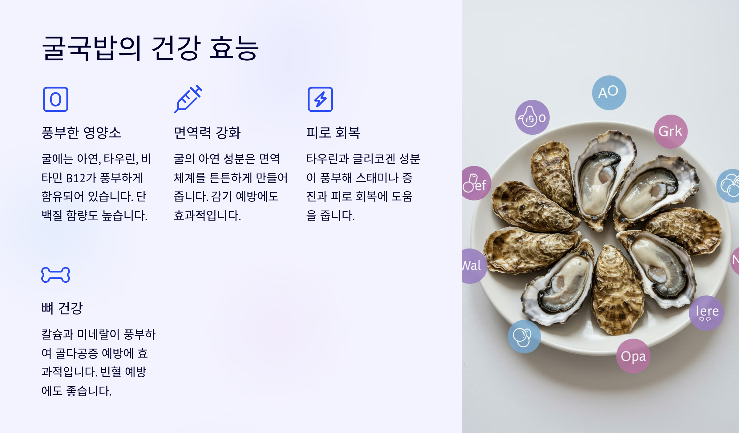 음식이에요. 바다의 우유라 불리는 굴에는 단백질, 철분, 아연, 오메가-3가 풍부하게 함유되어 있어요.