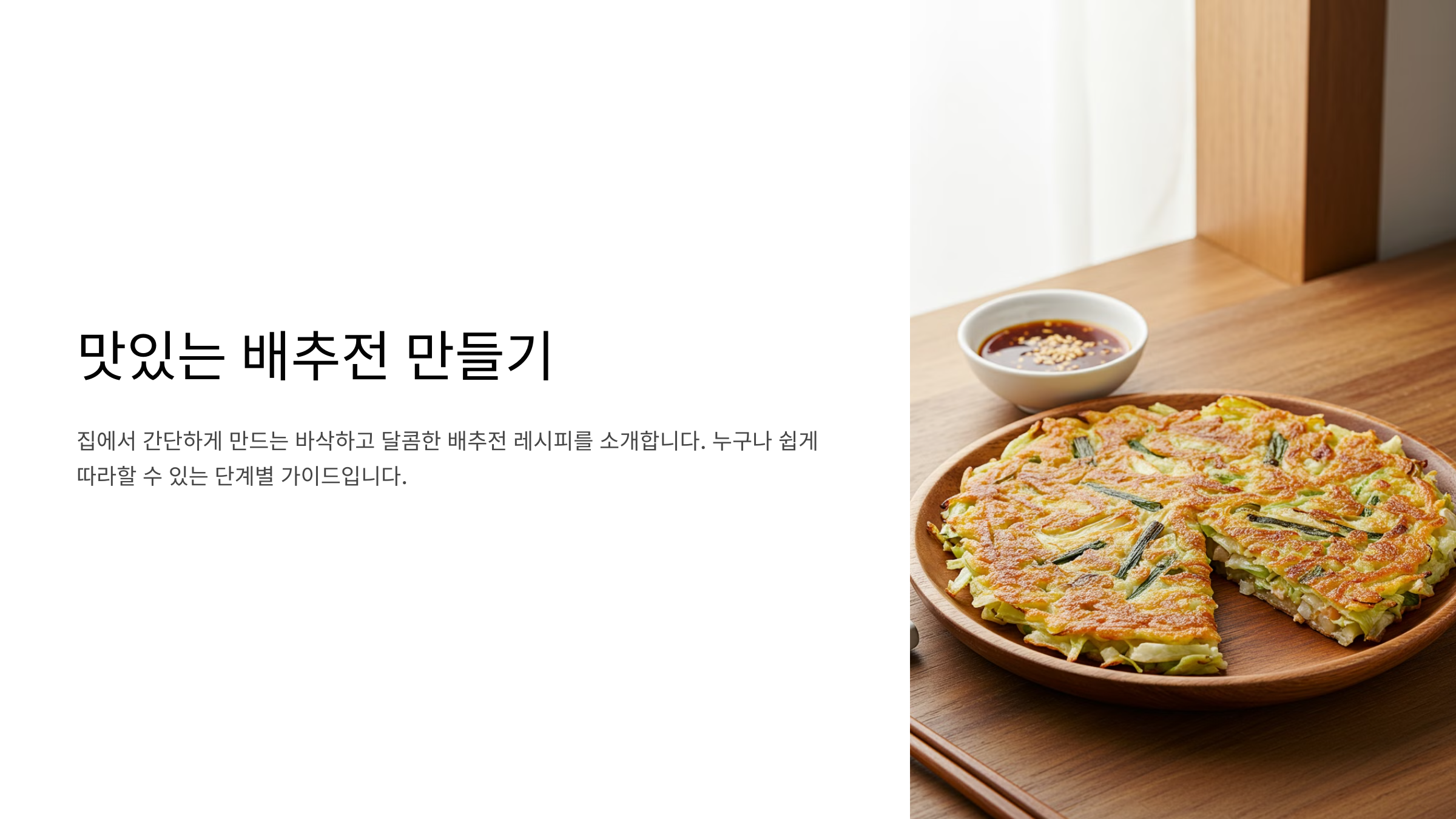 팬을 충분히 달군 후 부쳐야 바삭하게 완성돼요. 기름도 적당히 사용하세요. - 배추전과 어울리는 반찬이 있을까요?