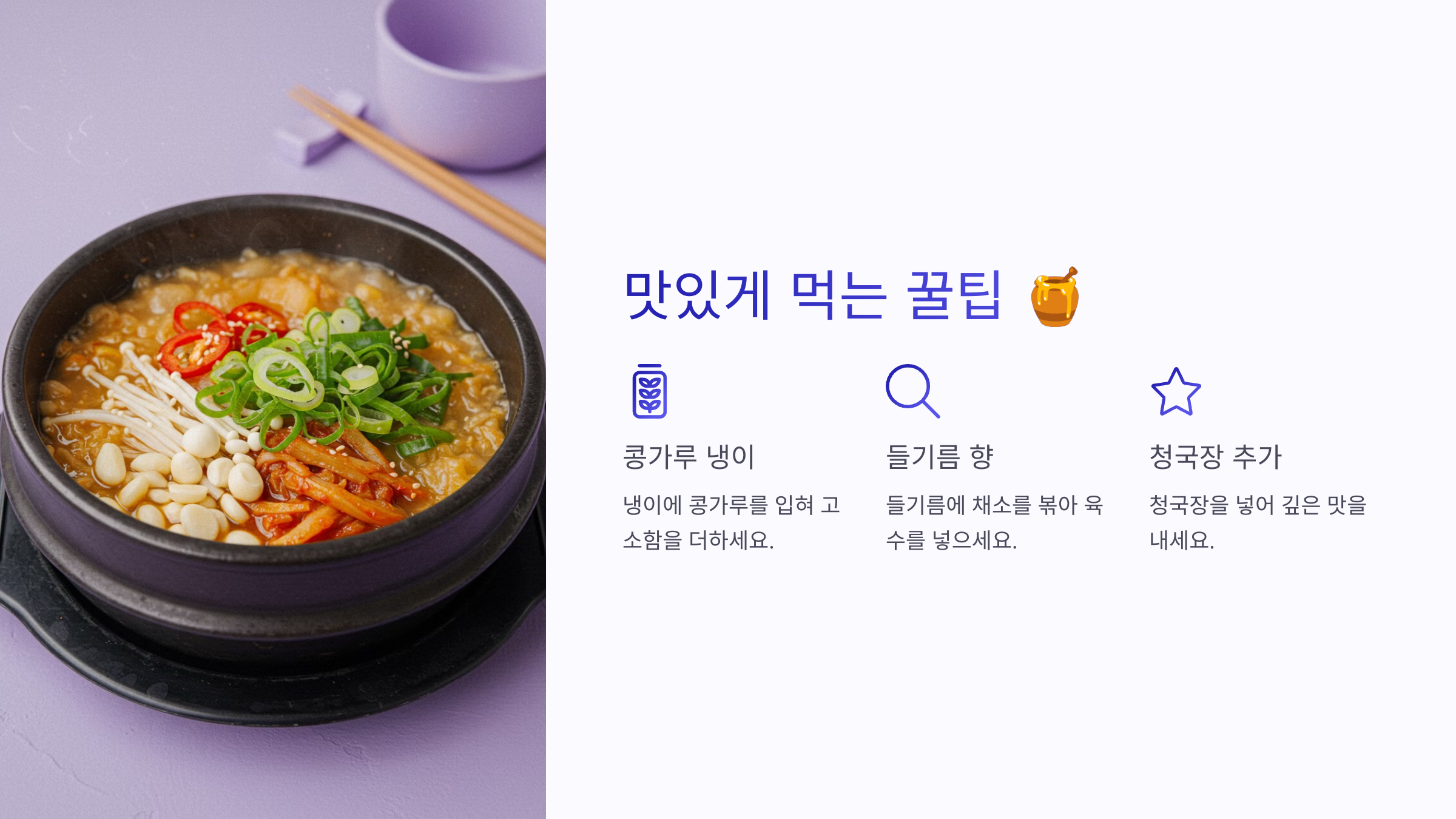 - 애호박과 버섯을 추가하면? 더욱 깊고 시원한 국물 맛을 즐길 수 있어요.
