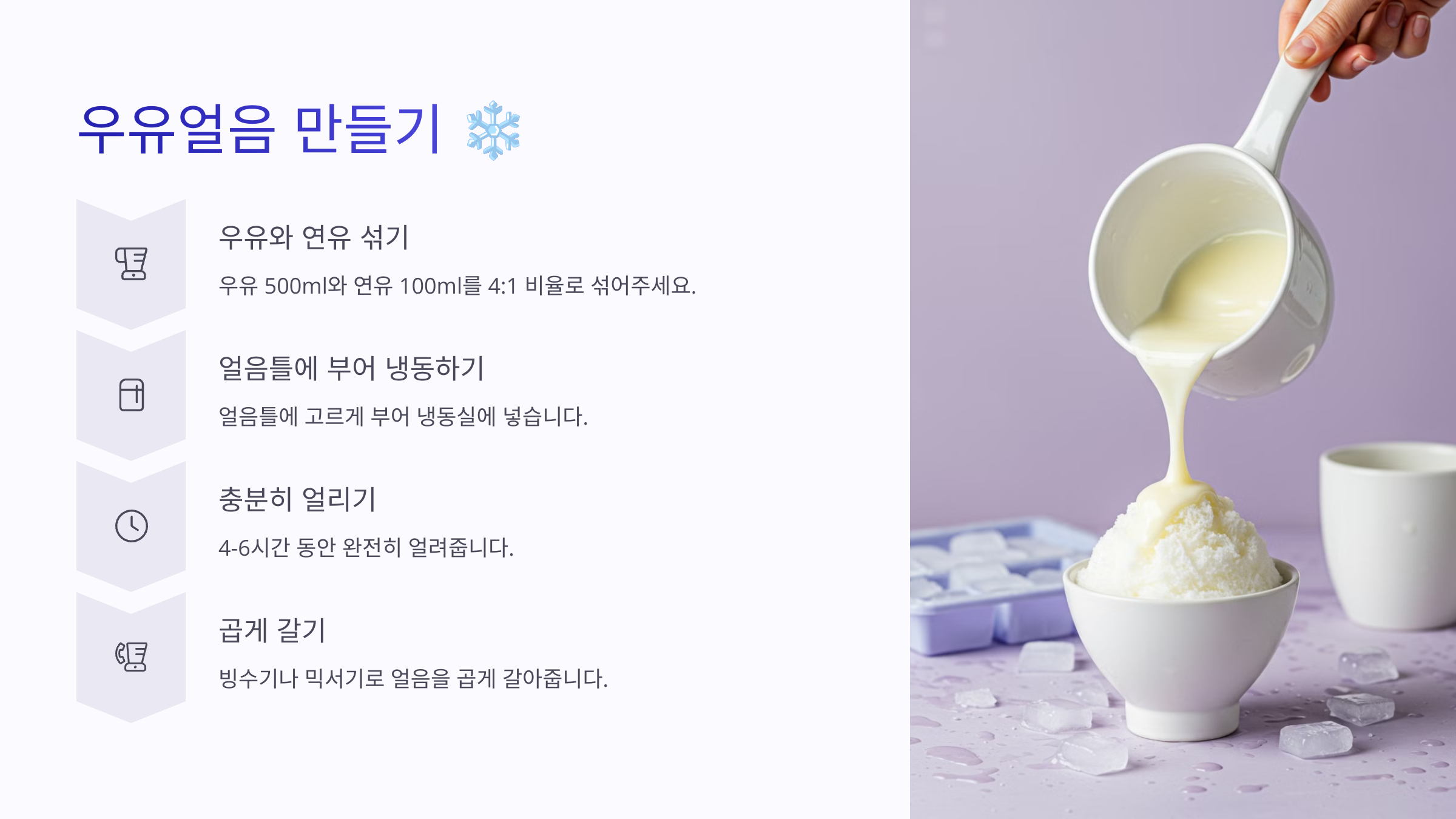 팥빙수의 시원한 식감을 살려줄 **우유얼음**을 먼저 만들어볼게요. 우유를 사용하면 고소한 맛이 배가된답니다!