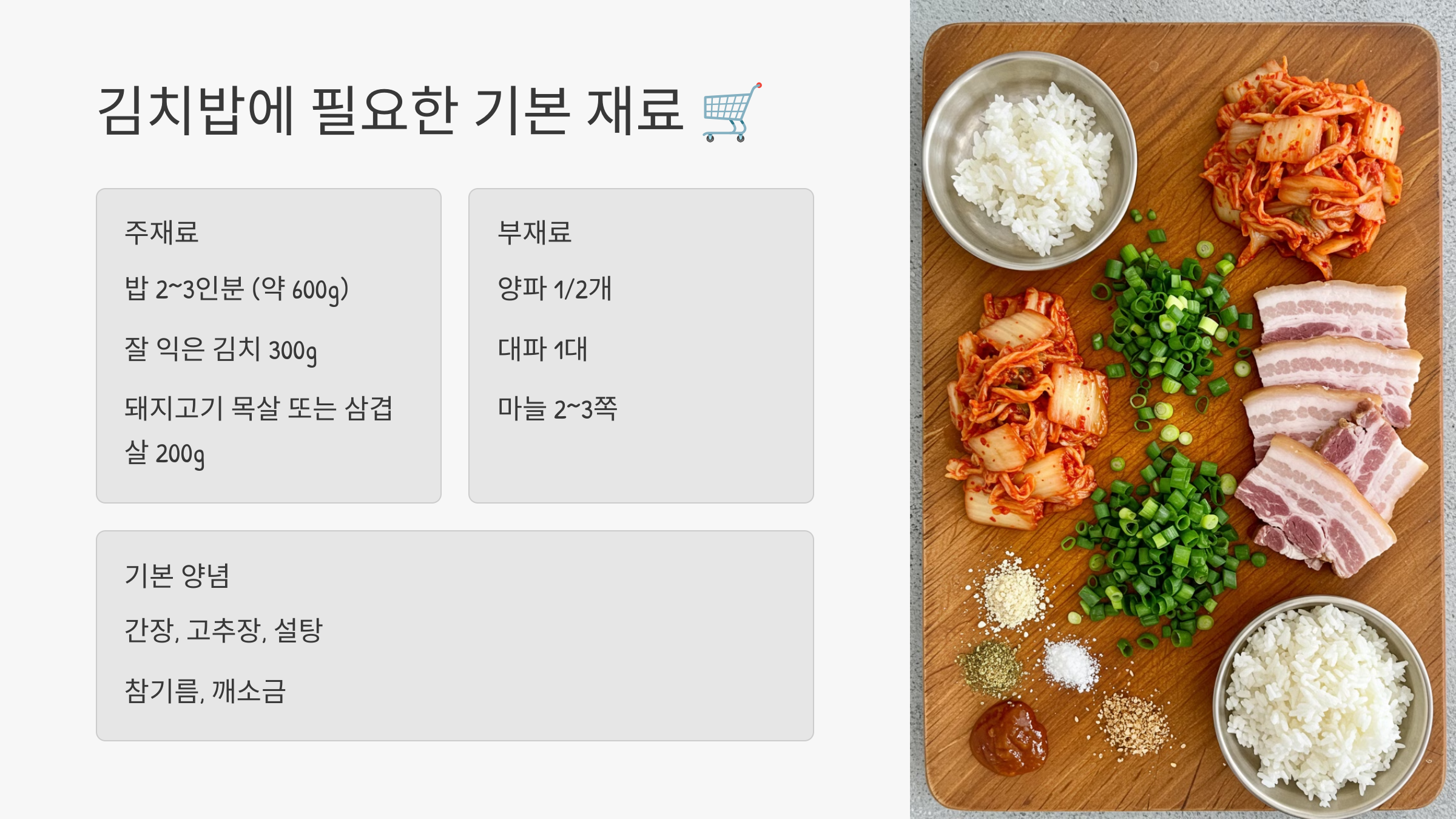 그럼 지금부터, 맛있는 김치밥 함께 만들어볼까요? 🍚🔥