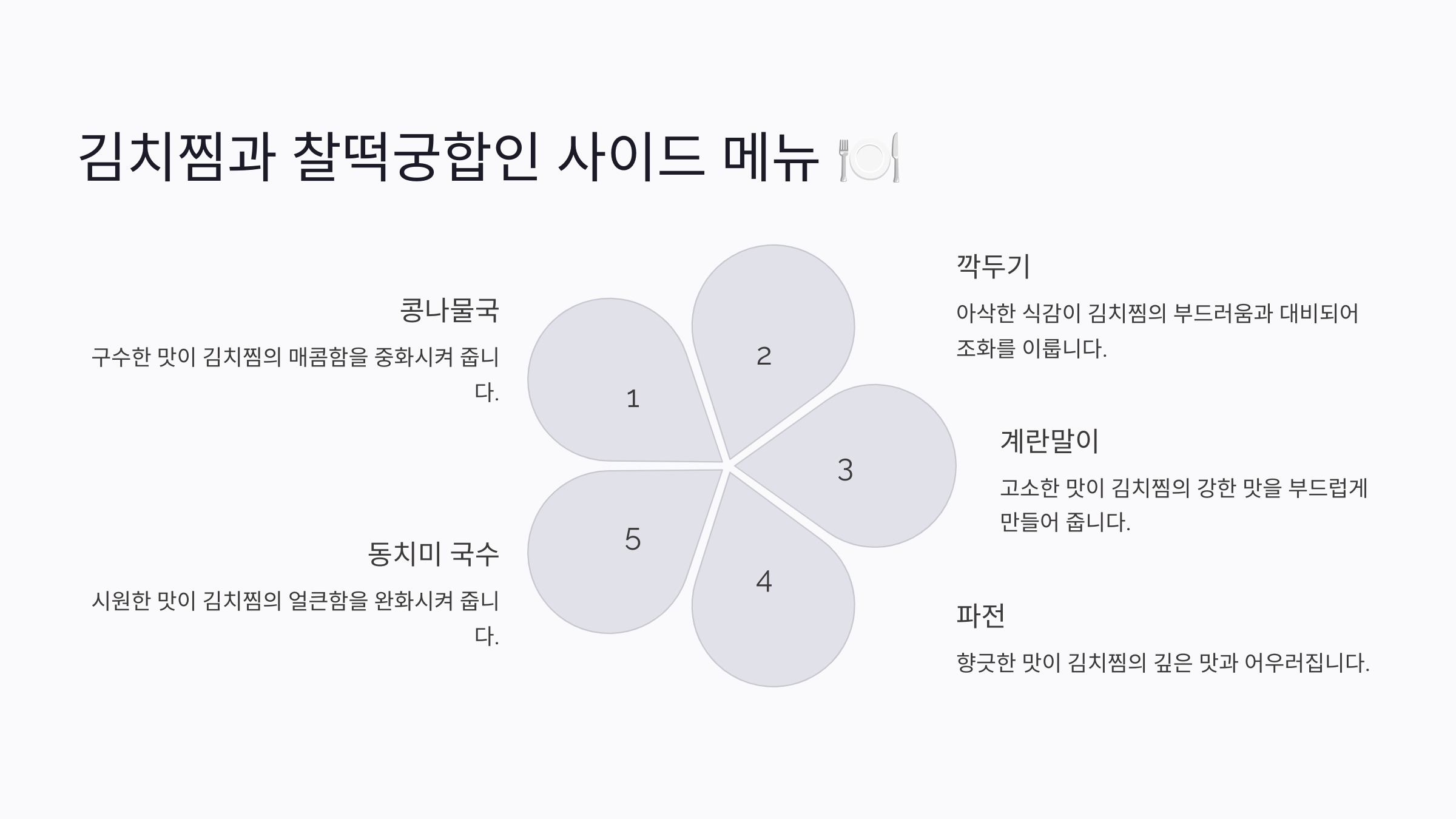 - 콩나물국: 시원한 국물이 김치찜의 맛을 한층 살려줘요.