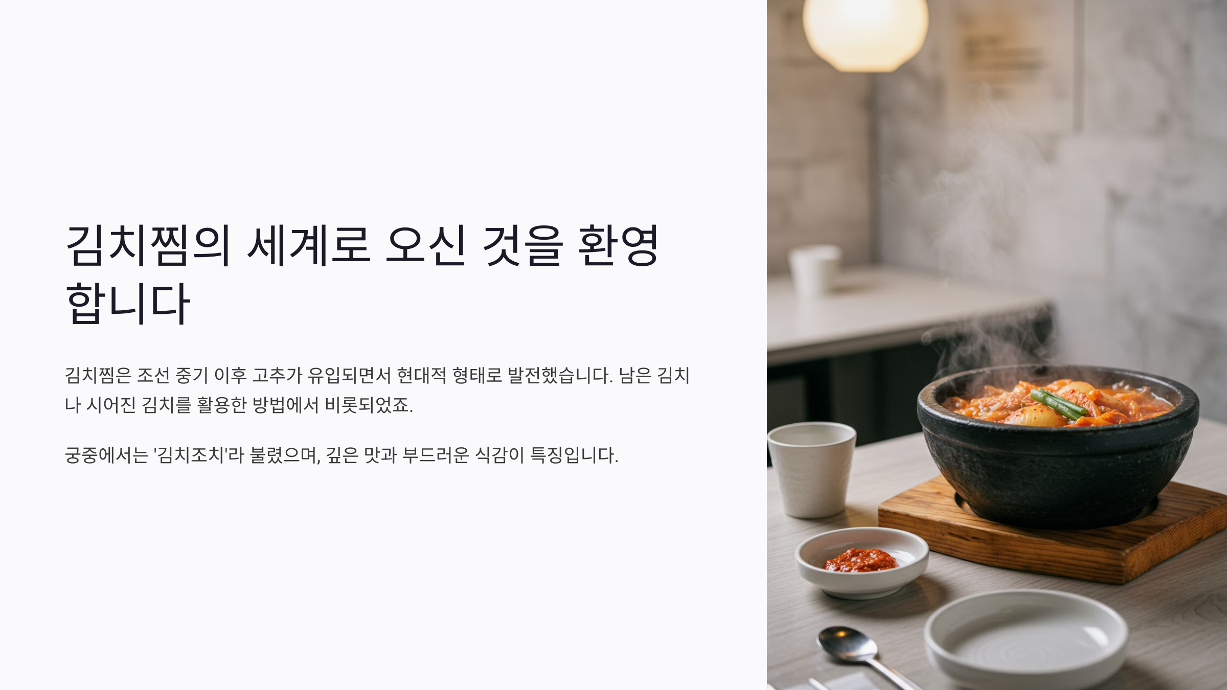 오늘은 김치찜에 대해 알아보았어요! 😊 깊고 진한 묵은지의 감칠맛과 부드러운 돼지고기의 조화, 거기에 밥 한 공기만 있으면 완벽한 한 끼가 완성되죠!