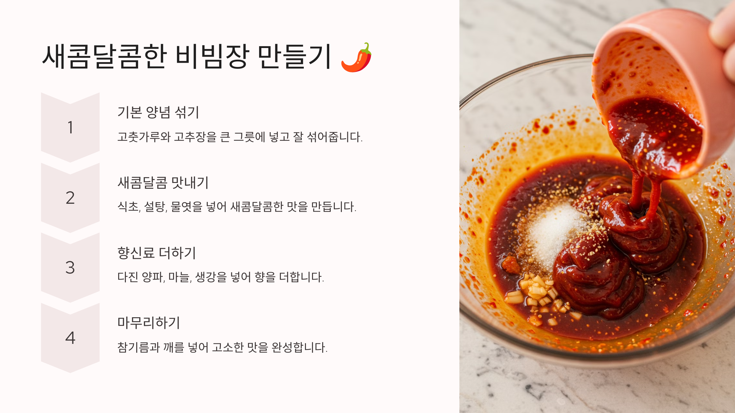 비빔냉면의 맛을 결정짓는 핵심은 바로 **비빔장!** 새콤달콤하면서도 매콤한 맛을 제대로 살려볼까요?
