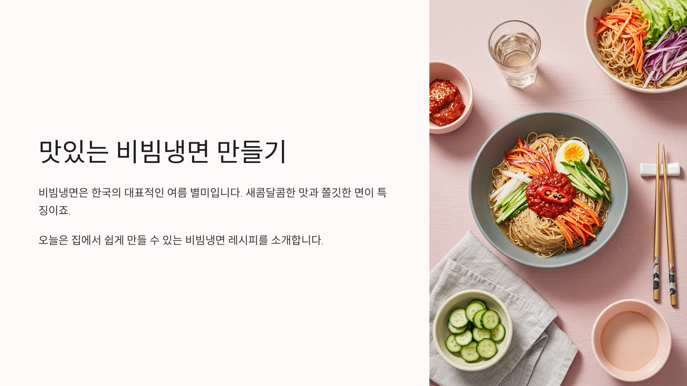 비빔냉면의 핵심은 **쫄깃한 면과 새콤달콤한 비빔장!** 간단한 재료만 있으면 집에서도 쉽게 만들 수 있어요. 😊