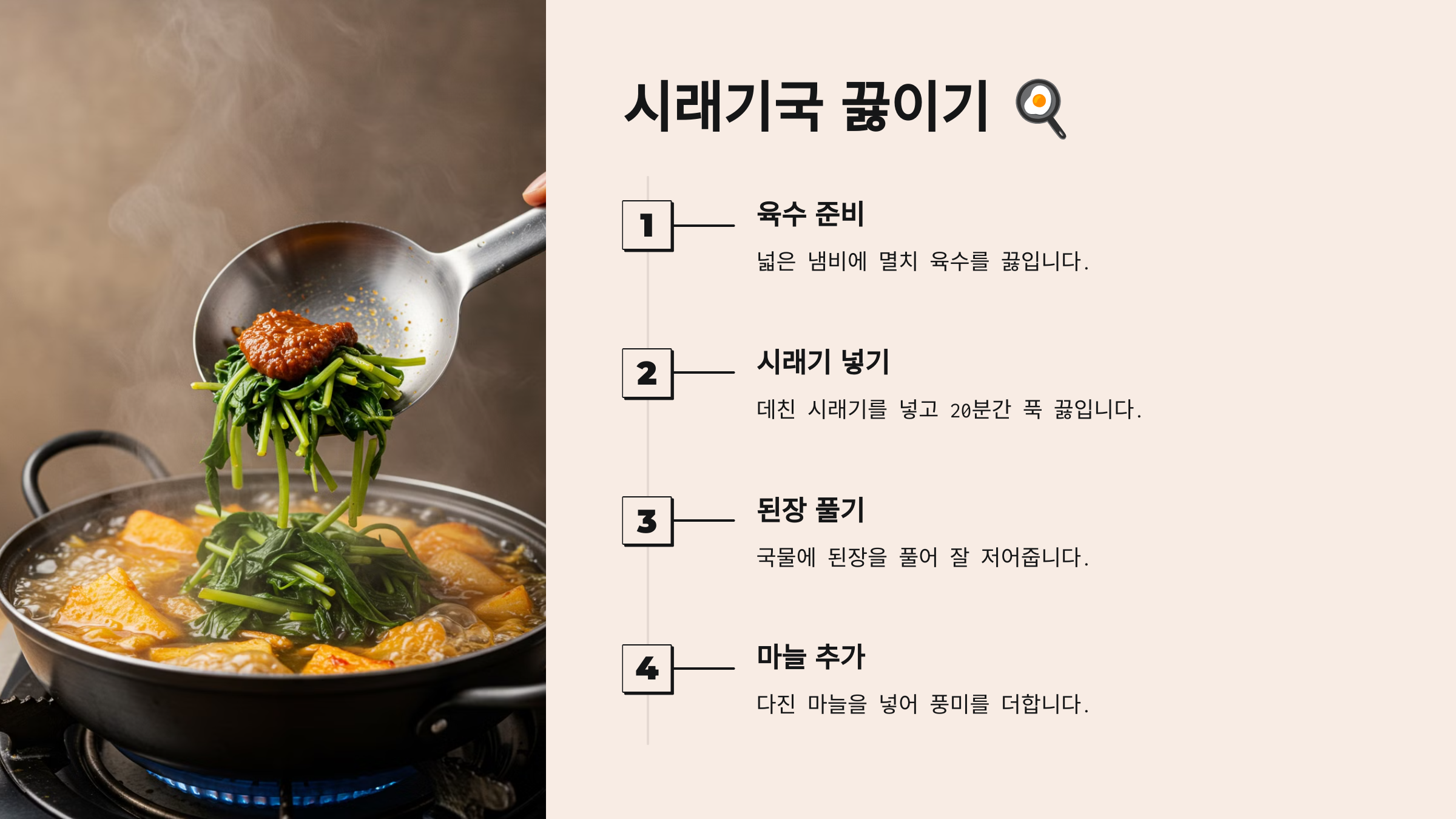 - 오래 끓일수록 시래기가 부드러워지고 맛이 깊어져요.