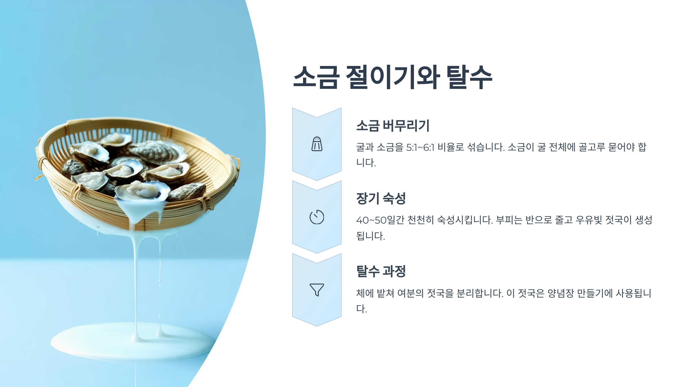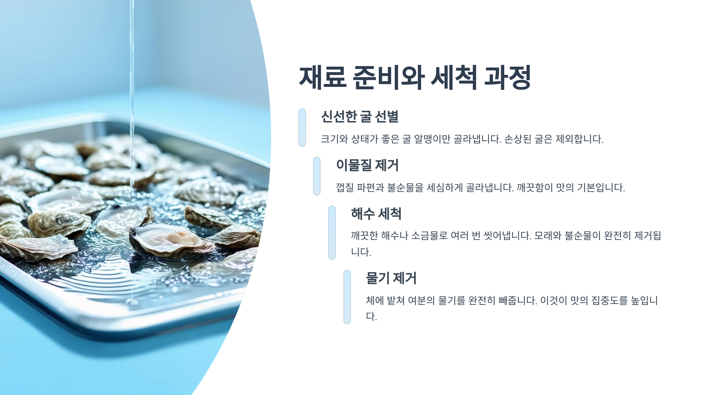 재료가 준비되었다면 이제 본격적으로 진석화젓의 첫 번째 핵심 단계, 절이기를 시작할 차례예요. 절이기는 단순히 간을 하기 위한 게 아니라, 수분을 빼고 잡내를 줄이며 저장성을 높이는 데 매우 중요한 과정이에요.