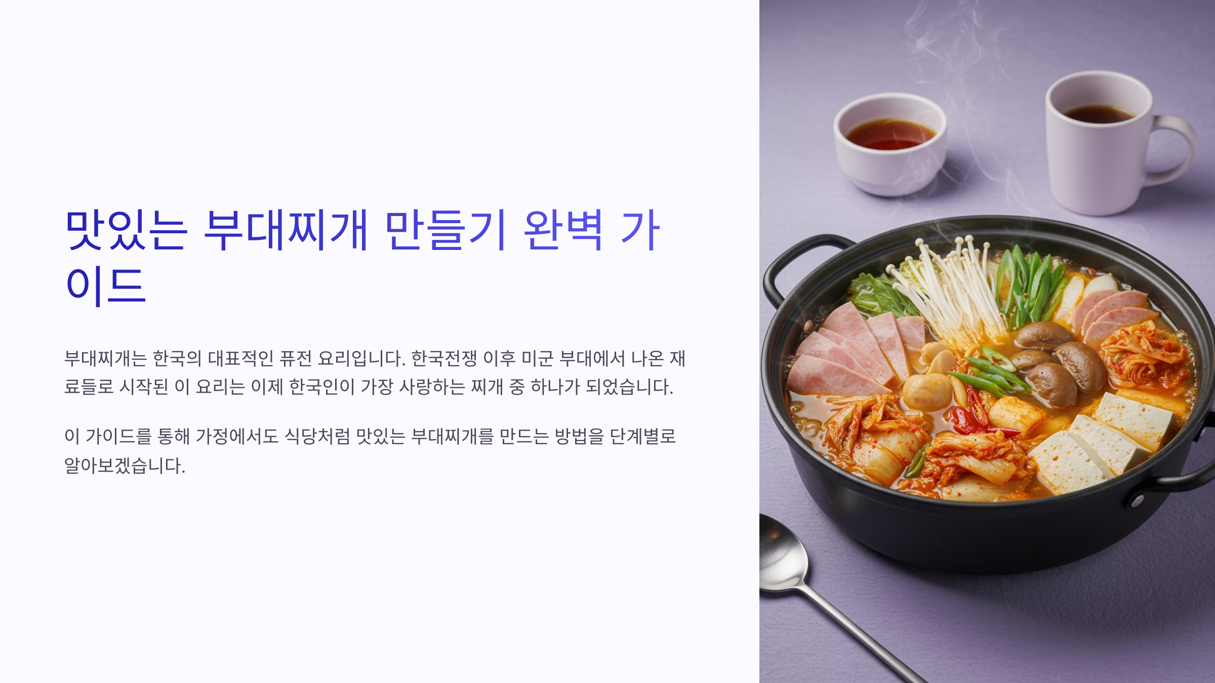 안녕하세요, 여러분! 😊 얼큰하고 푸짐한 **부대찌개**, 생각만 해도 군침 돌지 않나요? 다양한 재료가 어우러져 깊고 진한 맛을 내는 이 요리는 누구나 좋아하는 인기 메뉴죠! 오늘은 **쉽고 간편하게 따라 할 수 있는 황금 레시피**를 소개해드릴게요. 🍲✨