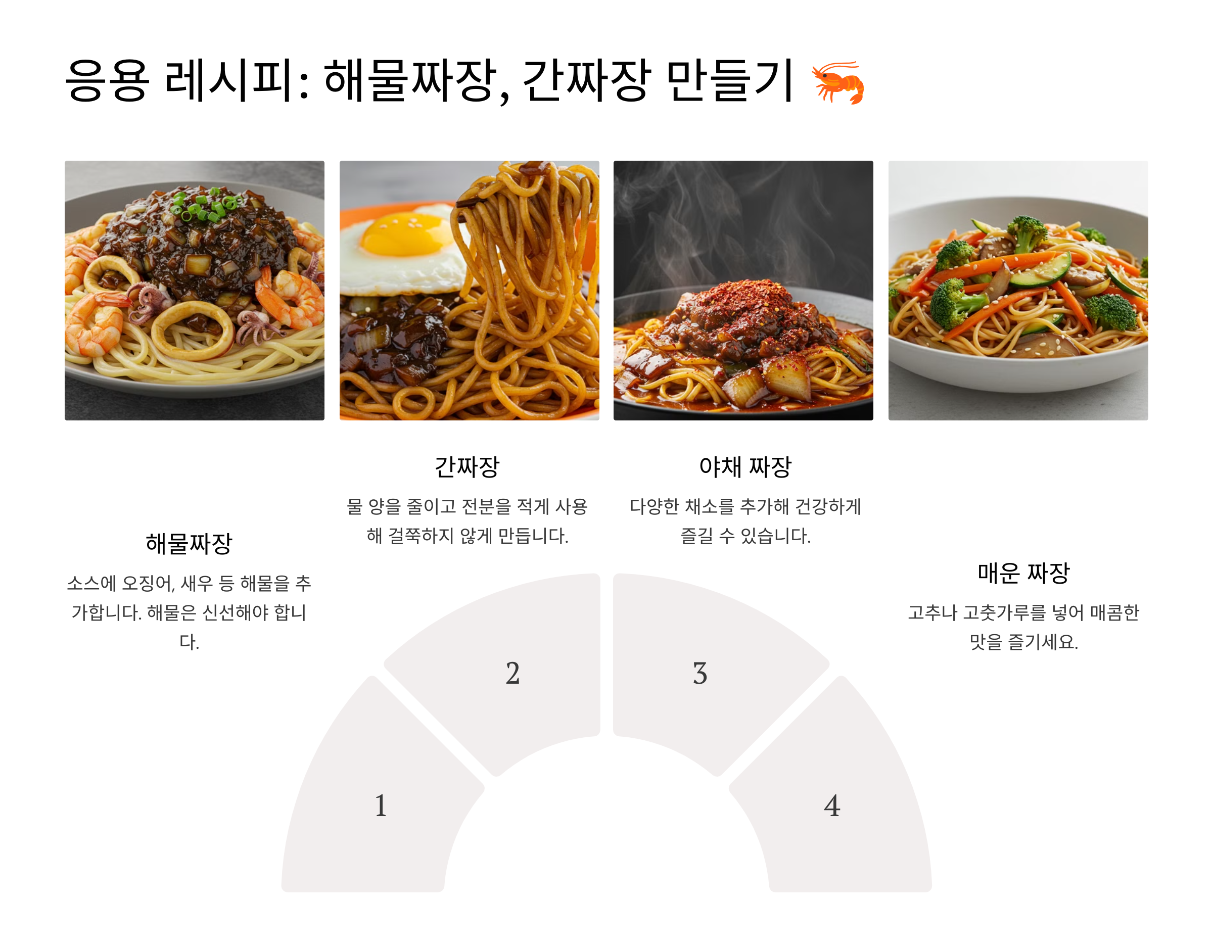 나만의 짜장면 만들기 도전! 위 레시피들을 기본으로 하되, 본인의 취향에 맞게 재료를 추가하거나 변형해보세요. 예를 들어 야채를 더 다양하게 넣거나, 매운 맛을 좋아한다면 고추나 고춧가루를 조금 넣어봐도 좋아요. 요리는 창의적인 과정이니 자유롭게 실험해보세요!