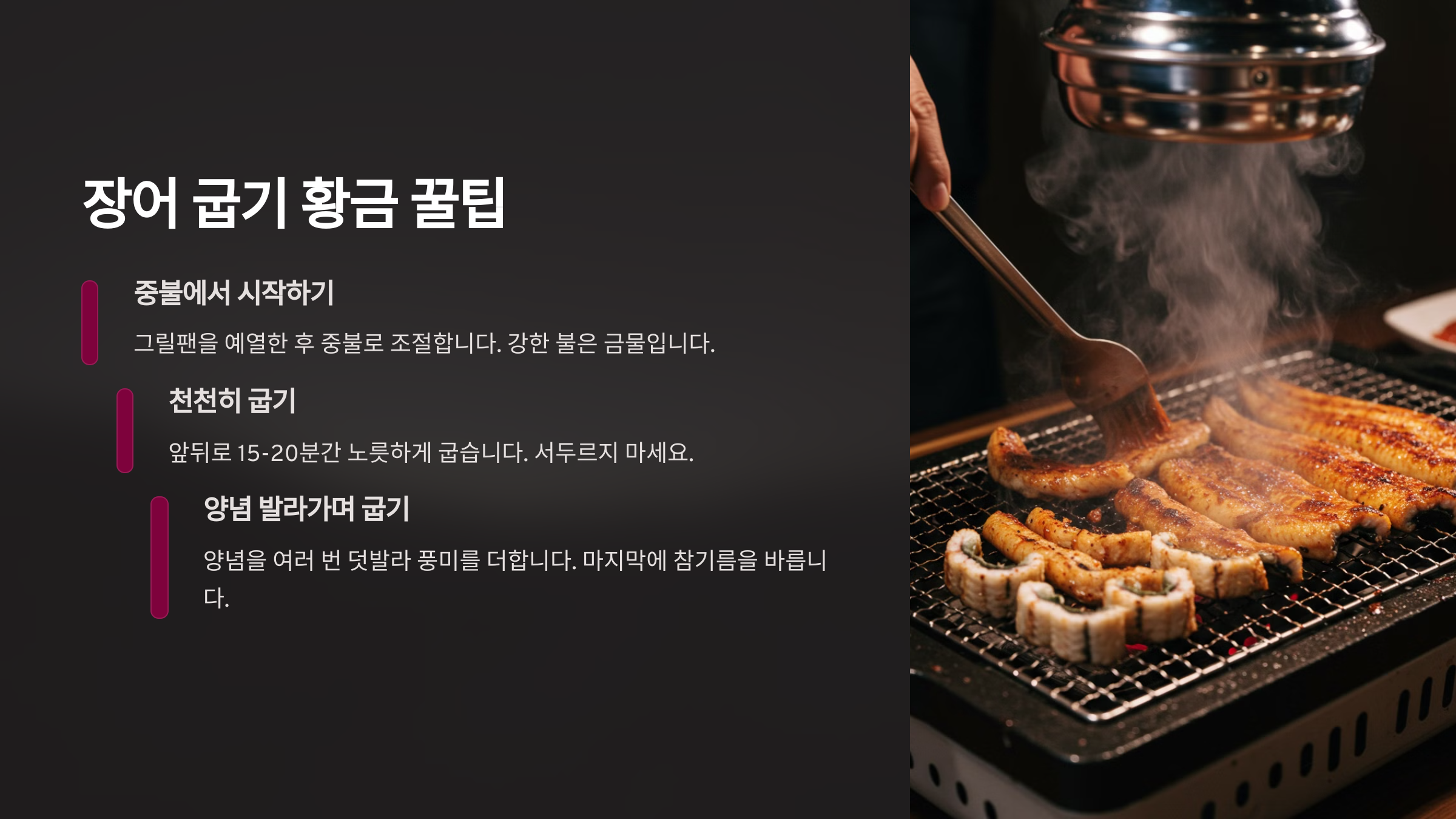 4. 장어 굽는 꿀팁! 불 조절이 핵심 🔥