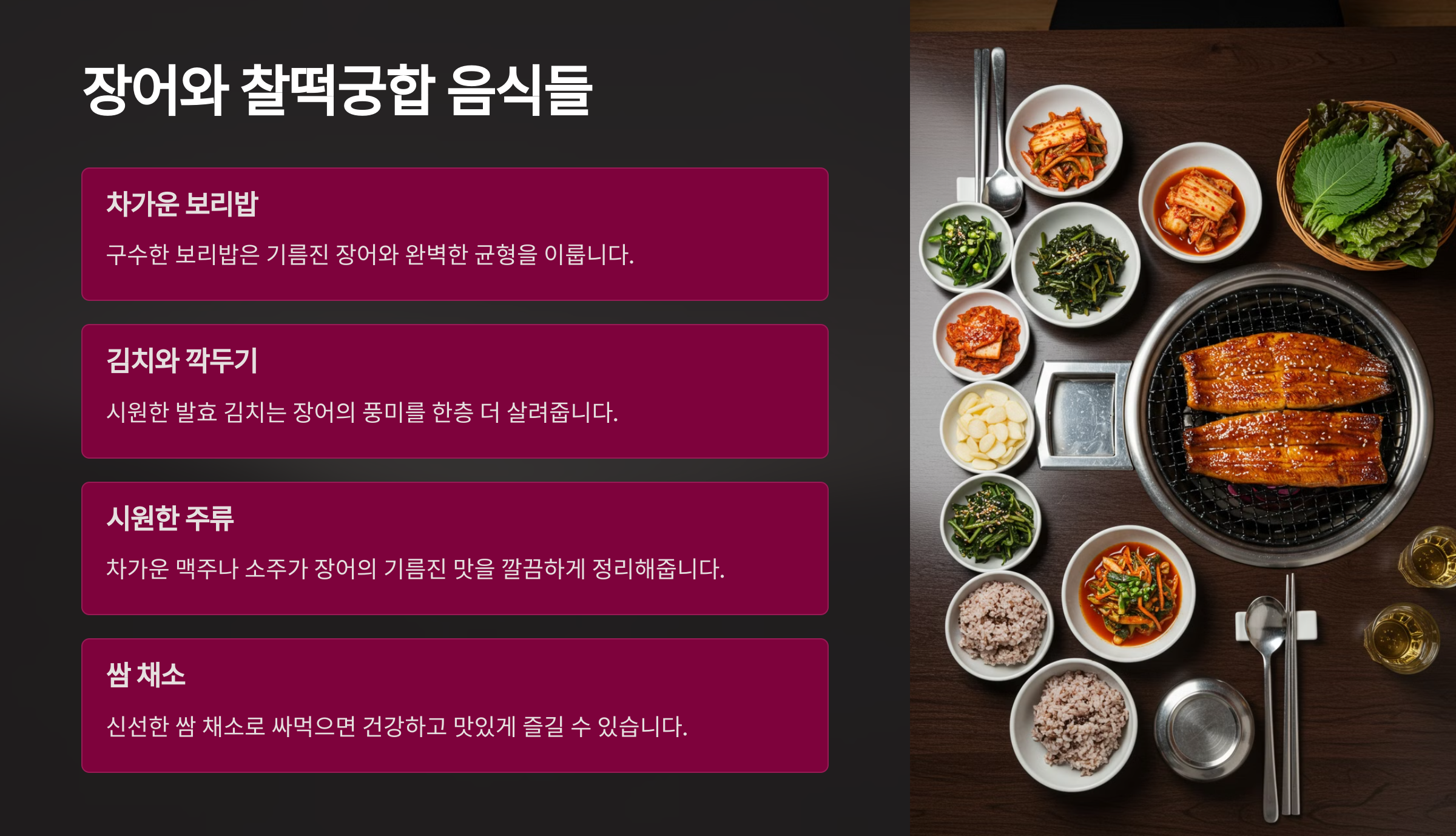 장어구이는 단독으로도 훌륭하지만, 함께 곁들이면 더 맛있고 건강해지는 음식들이 있어요. 아래는 장어와 찰떡궁합인 식재료 리스트입니다.