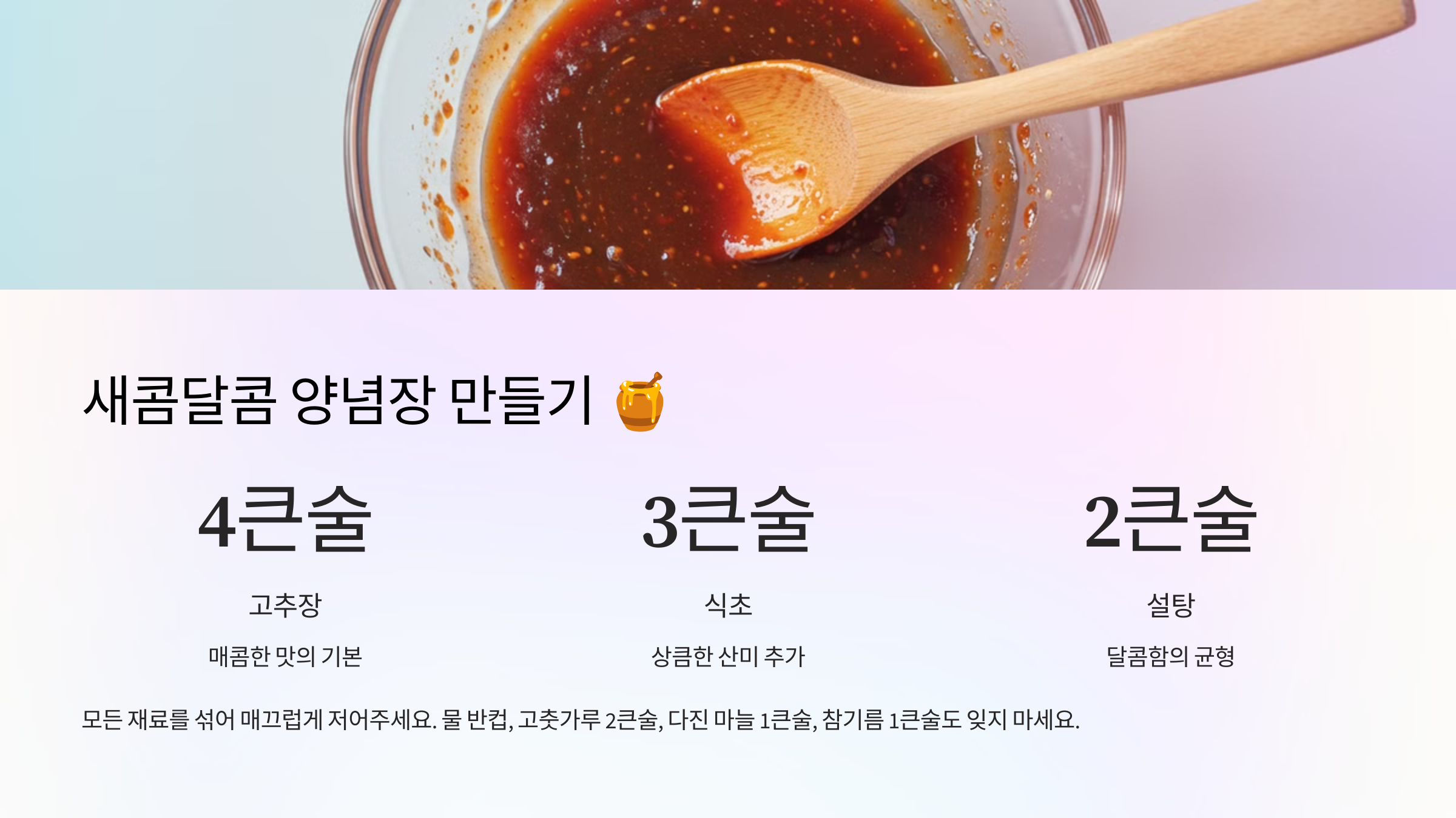 고추장 양을 줄이고 설탕과 식초를 조금 더 넣어주세요. - 더 고소한 맛을 원하면?