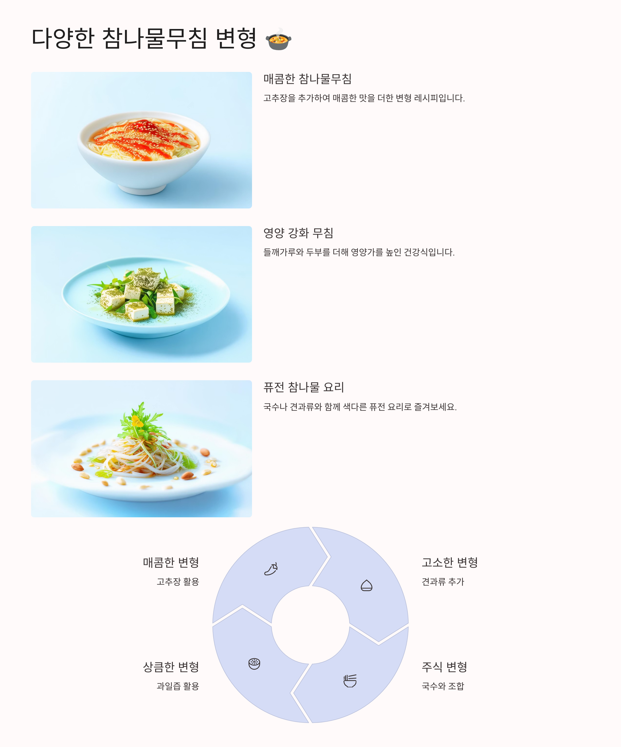 참나물무침은 간단하면서도 다양한 방식으로 변형할 수 있는 요리입니다. 기본적으로 참나물의 신선한 향과 고소한 맛을 살리면서도, 각종 재료와 양념의 조합을 통해 새로운 맛을 창조할 수 있습니다.